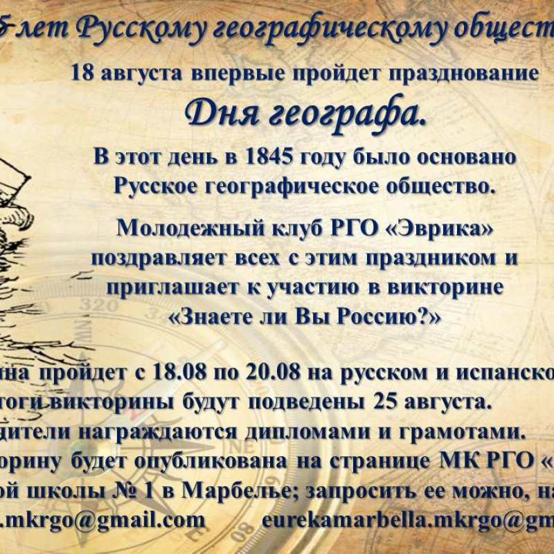 8 августа впервые в мире отметят День географа. В этот день ровно 175 лет назад было основано Русское географическое общество. Молодежный клуб РГО «Эврика» и Русская школа N 1 в Марбелье поздравляют...