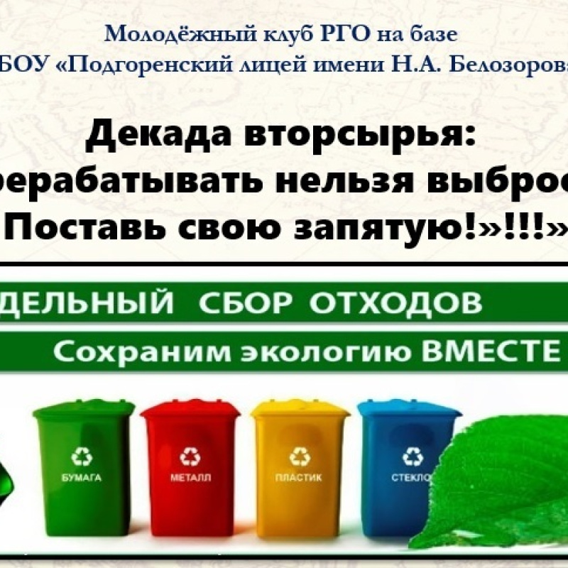 В конце ноября Молодежный клуб РГО на базе Подгоренского лицея имени Н.А. Белозорова организовал проведение Декады вторсырья «Перерабатывать нельзя выбросить. Поставь свою запятую!», в которой...
