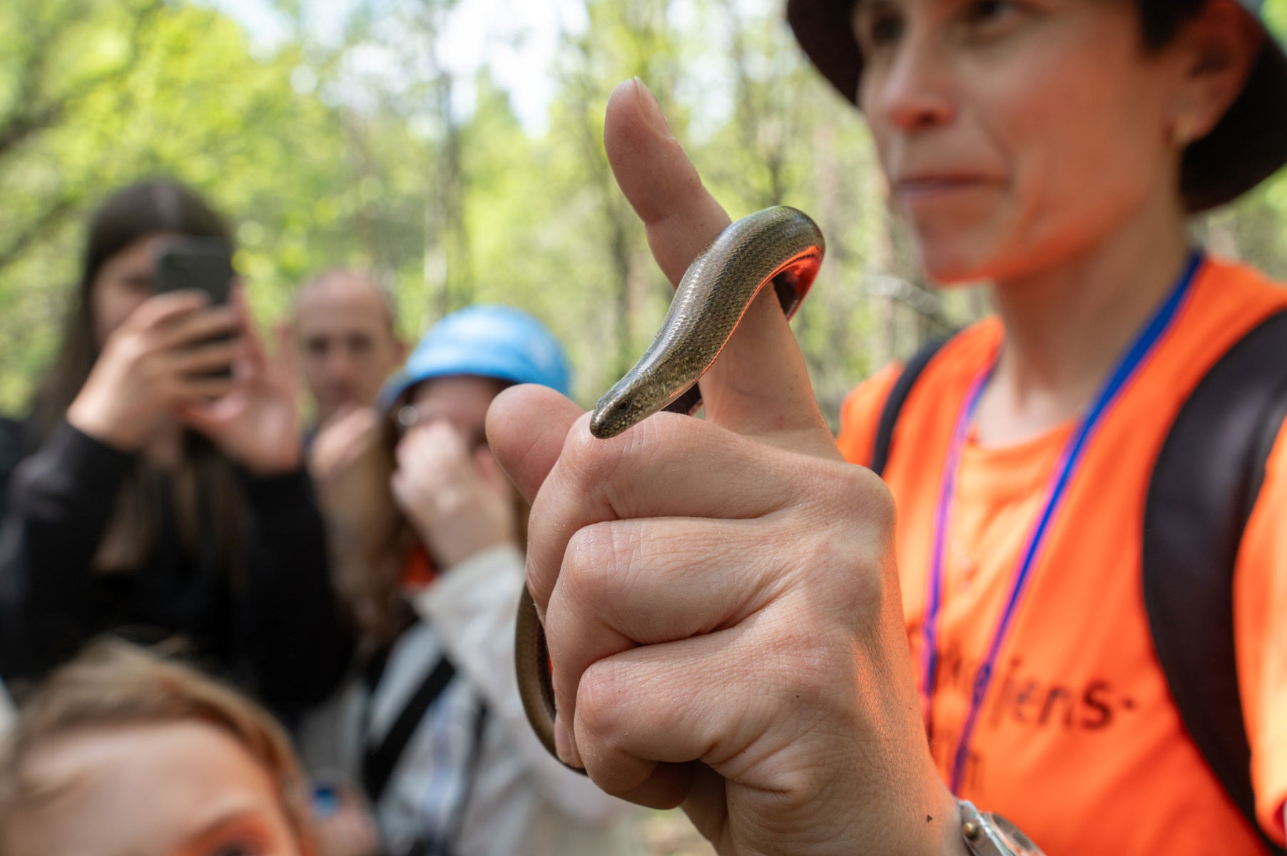 Существо с приятным характером похоже на змею, но никакого отношения к змеям не имеет. Молодые веретеницы сверху красивого серебристо-белого или светло-кремового цвета с двумя тонкими темными линиями на спине. Своё родовое название безногая ящерица получила не только из-за веретеновидного тела, но и за своеобразную повадку. Если у веретеницы не получается выдернуть червя из норки, то она вытягивается в длину и начинает, как веретено, быстро вращаться в одну сторону, отрывая часть добычи. Подчеркнём, что ящерица безобидна и приносит человеку пользу, уничтожая вредителей. Если повезёт, её удастся не только увидеть, но и сфотографировать прямо в руках. У наших активистов это получилось!