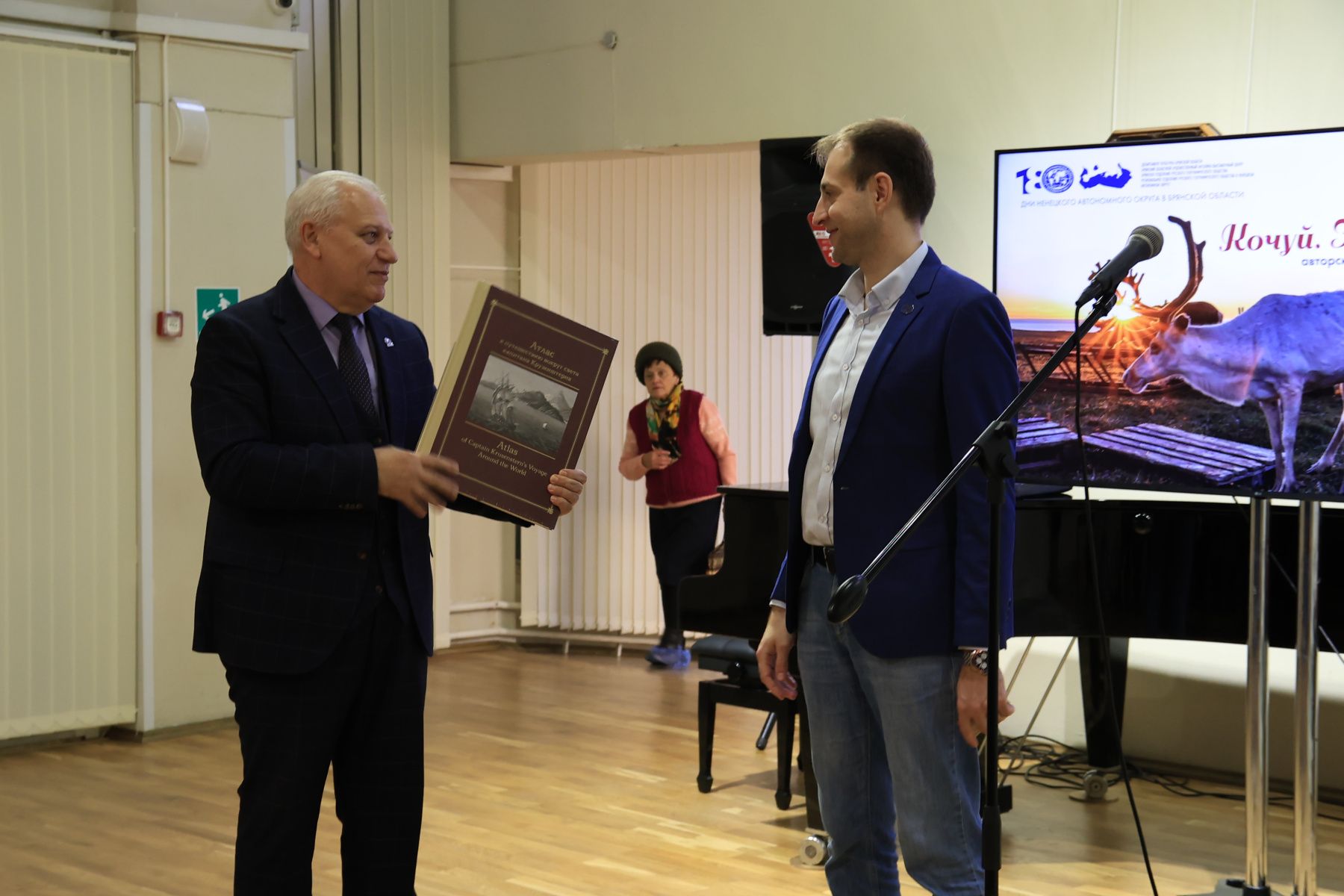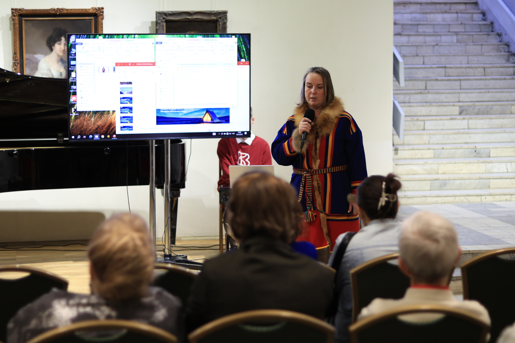 Заместитель председателя регионального отделения РГО в Ненецком Автономном округе Алина Андриянова провела экскурсию по фотовыставке "Кочуй. Живи. Люби" и предметам материальной культуры ненцев. Также в рамках "Клуба путешественников" Алина показала гостям фильмы "Ямб то ню (Дети Долгого озера)" и "Ненецкий автономный округ". Особый интерес среди участников вызвал рассказ Алины о жизни северных оленей "Хозяин бархатных рогов".