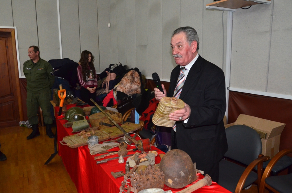 Член поискового отряда, учитель ОБЖ средней школы поселка Терскол, полковник в отставке Магомед Непеев, в свою очередь, рассказал ребятам о найденных элементах оружия, амуниции, личных вещах, принадлежащих советским и немецким солдатам. Особый интерес у юношей и девушек вызвали советская солдатская фляжка с инициалами бойца, кружка с двумя пулевыми отверстиями, немецкая печатная машинка, портативная печка-спиртовка и динамомашина.