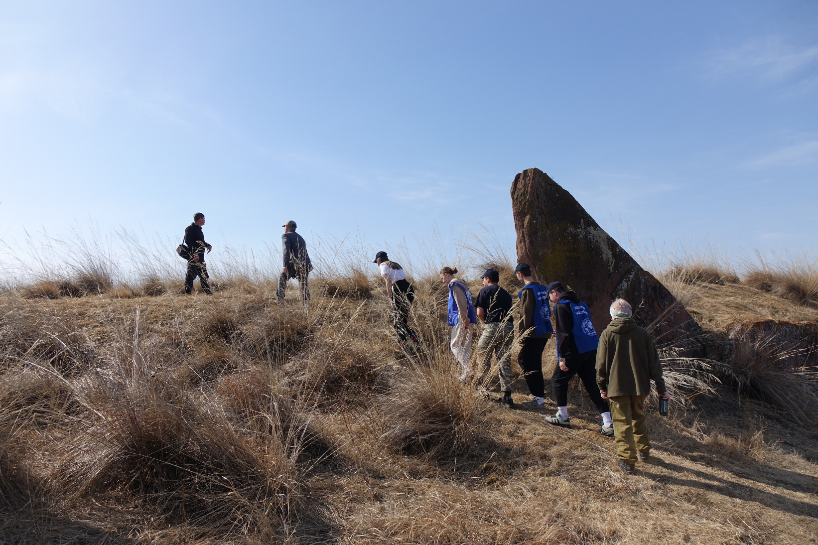 Следующей точкой экспедиции стало посещение каменоломни в окрестностях с. Весеннее и озера Улух-Коль. Участники мероприятия определяли тип горной породы, осуществляли отбор образцов для лабораторных исследований (геохимический анализ, спектрографический анализ), провели сравнительное описание геологического строения плит, что позволит определить происхождение строительного материала Салбыкских курганов.