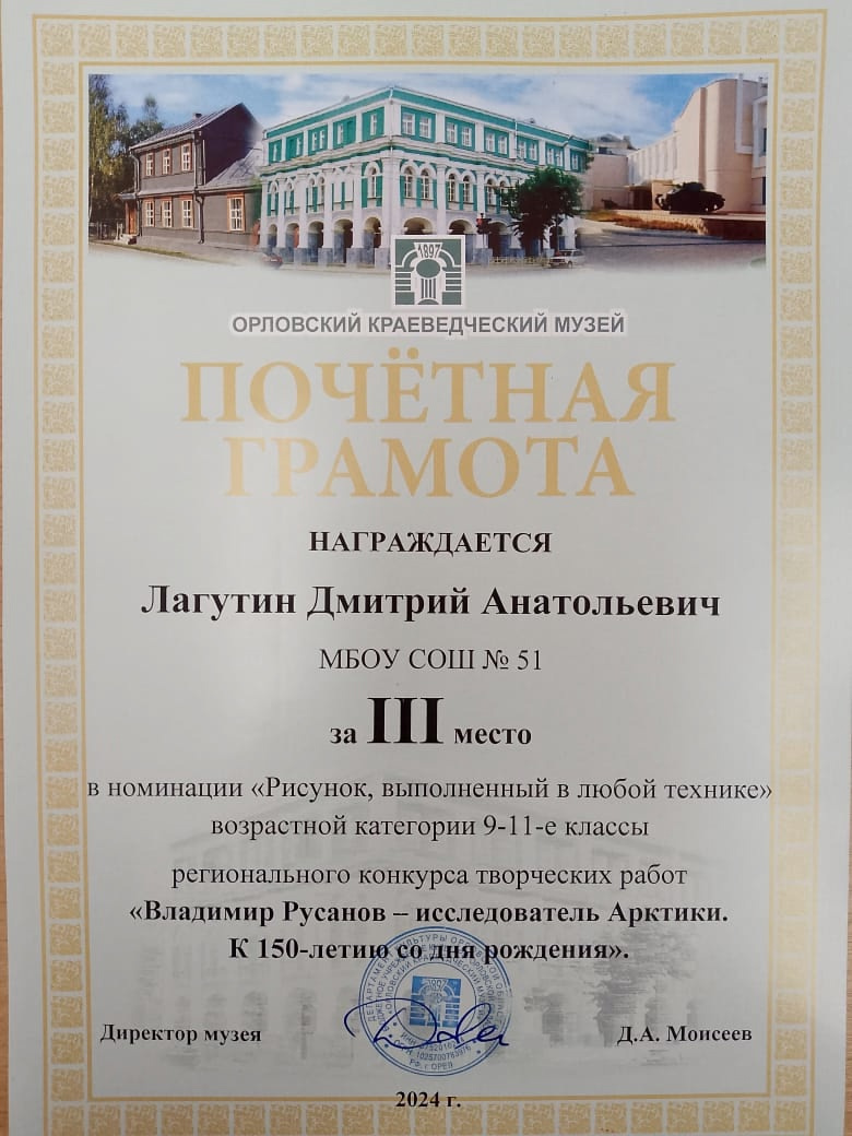 В Орловском краеведческом музее состоялась церемония награждения участников и победителей регионального конкурса творческих работ «Владимир Русанов – исследователь Арктики. К 150-летию со дня рождения».