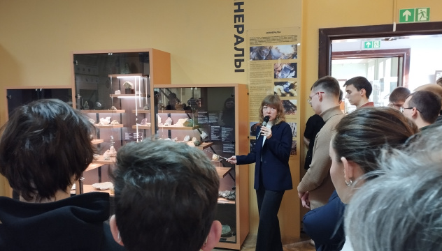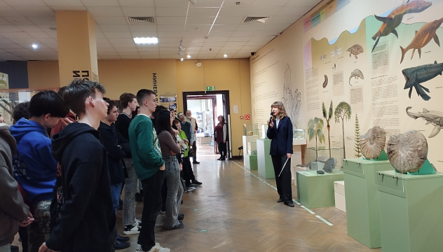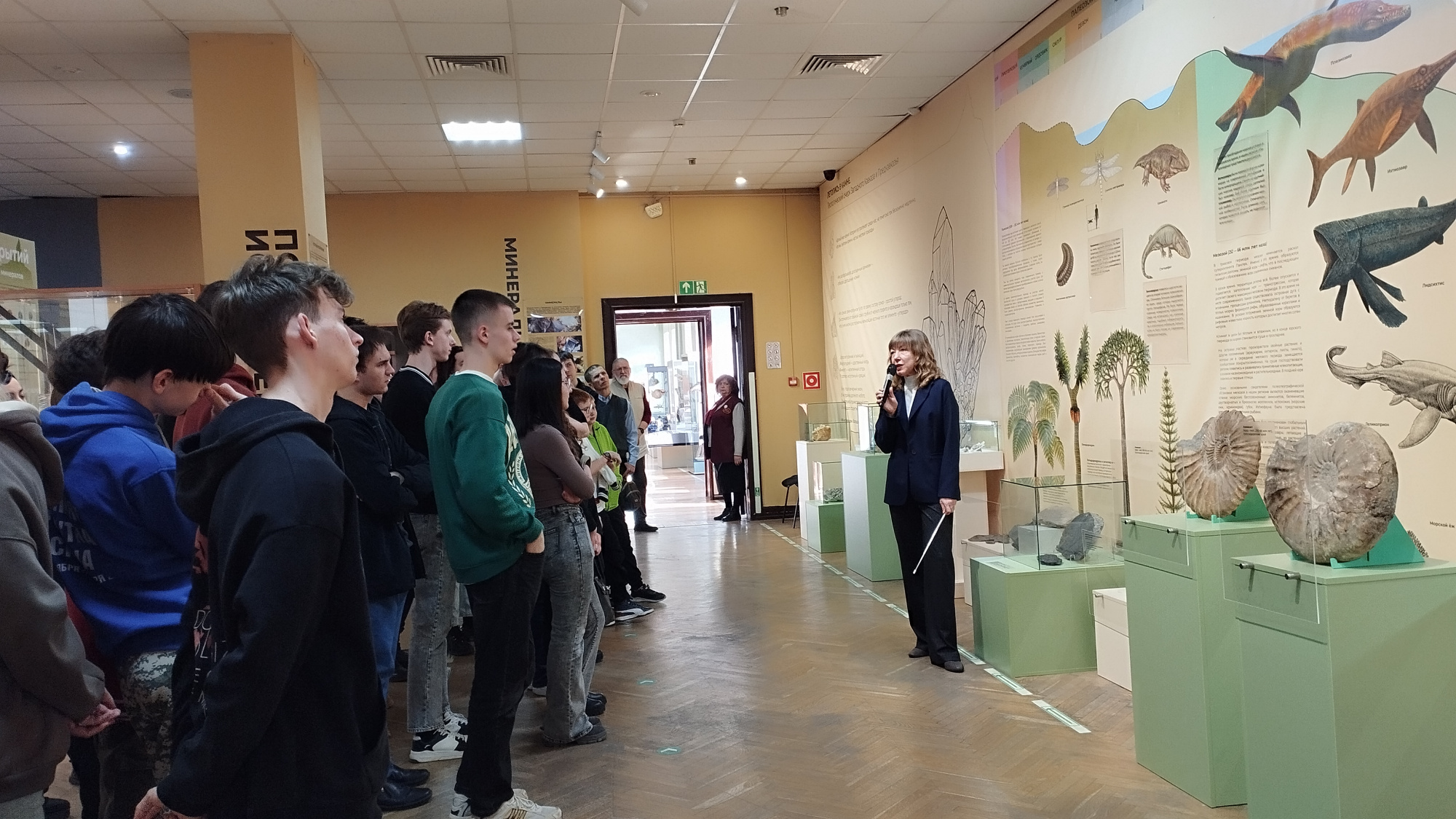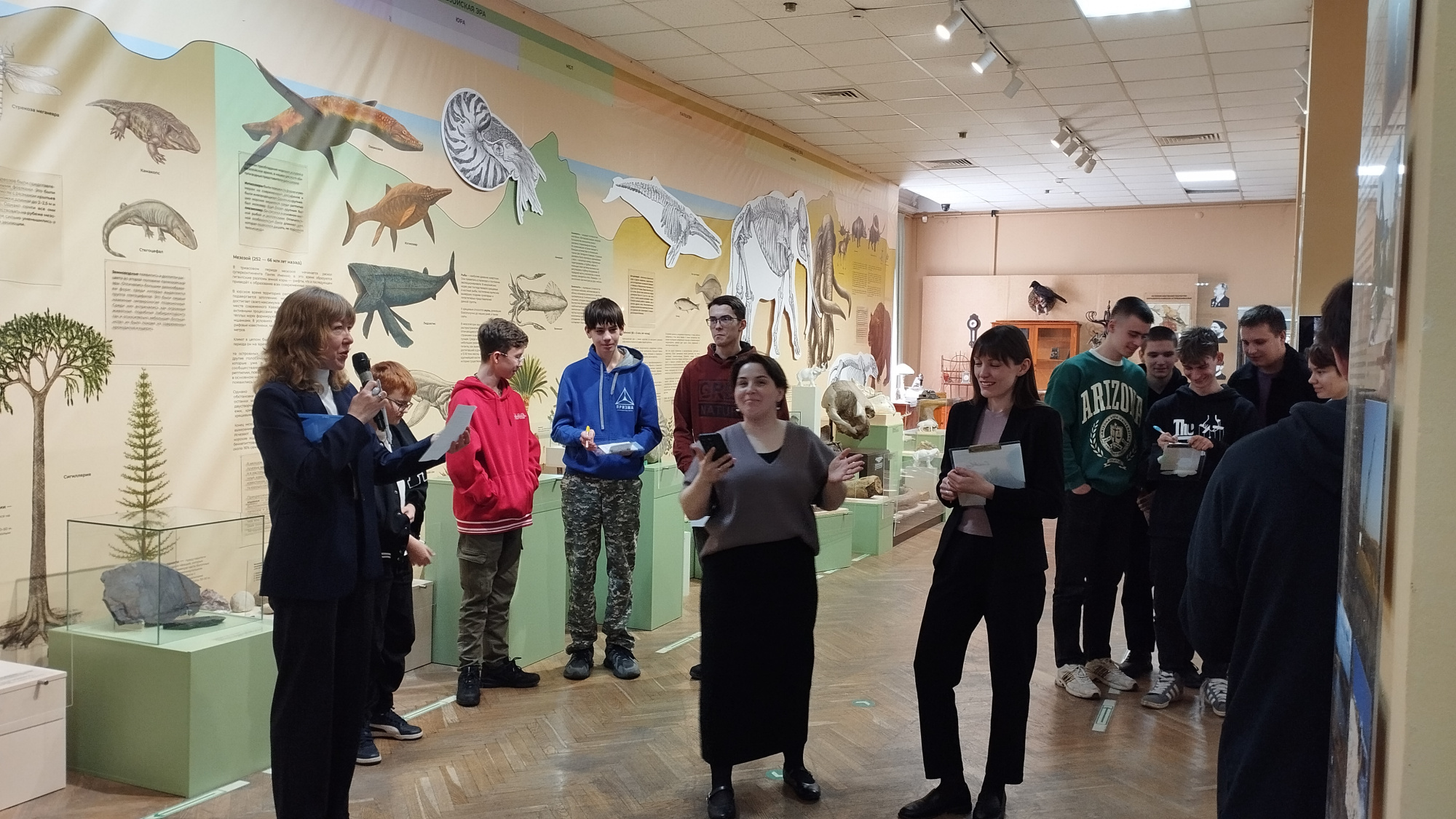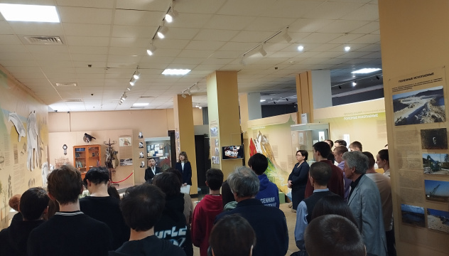 Куратор выставки Оксана Юрьевна Крицкая провела обзорную экскурсию, акцентируя внимание присутствующих на уникальных экспонатах: минералы из посёлка Никель, в том числе и с уранинитом, минеральных находках с мыса Железный Рог, череп Фанагорийского слона, полный скелет кита Цетотерия, кости пещерного медведя.
