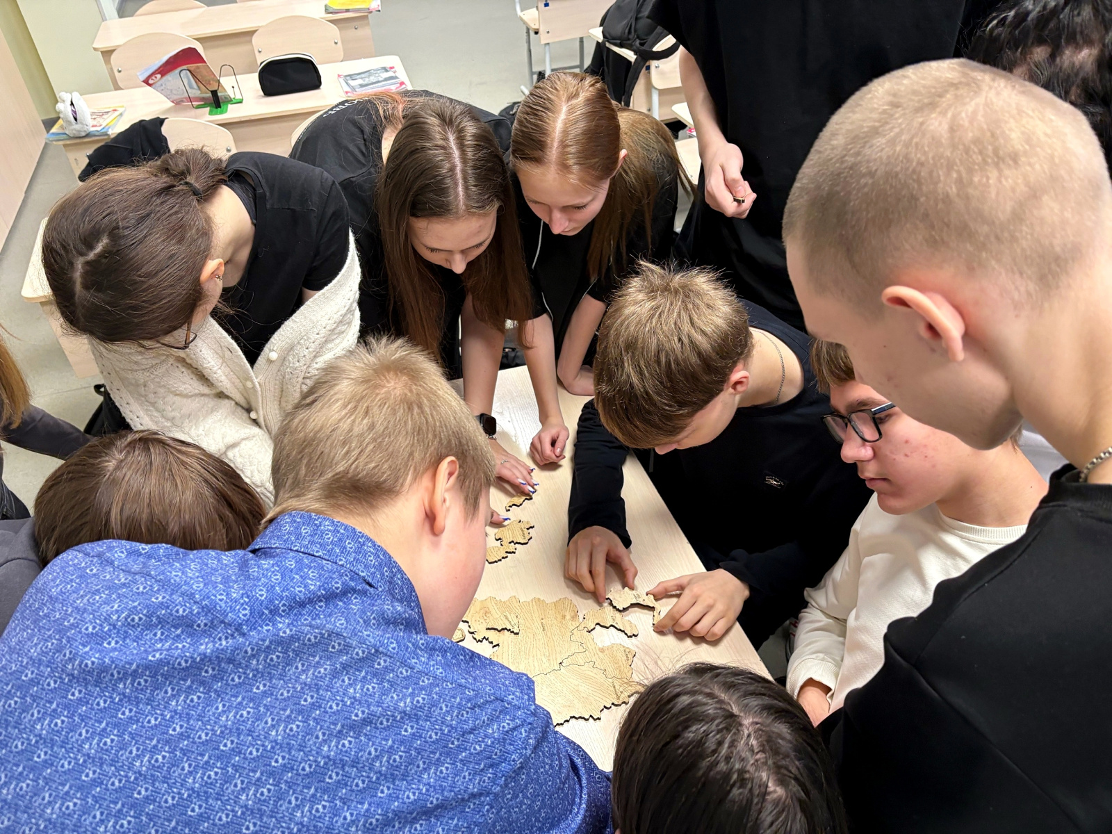 Самым захватывающим моментом встречи стала практическая часть. Школьники с азартом включились в процесс и попробовали собрать спилс-карту Российской Федерации на время. Работа кипела – участники искали нужные регионы, соединяя их в единую карту страны. Команда, которая показала лучший результат и быстрее всех справилась с заданием, была награждена сладкими призами от гостей. Остальные участники тоже не остались без новых знаний и положительных эмоций.