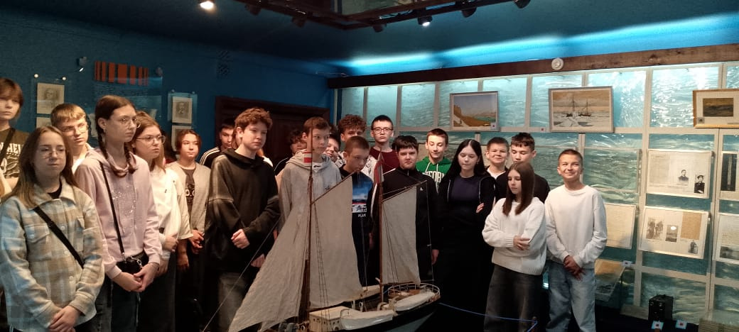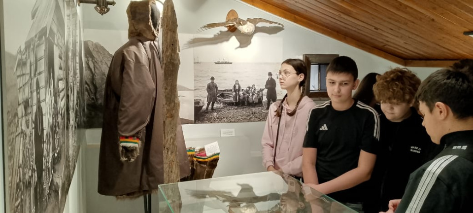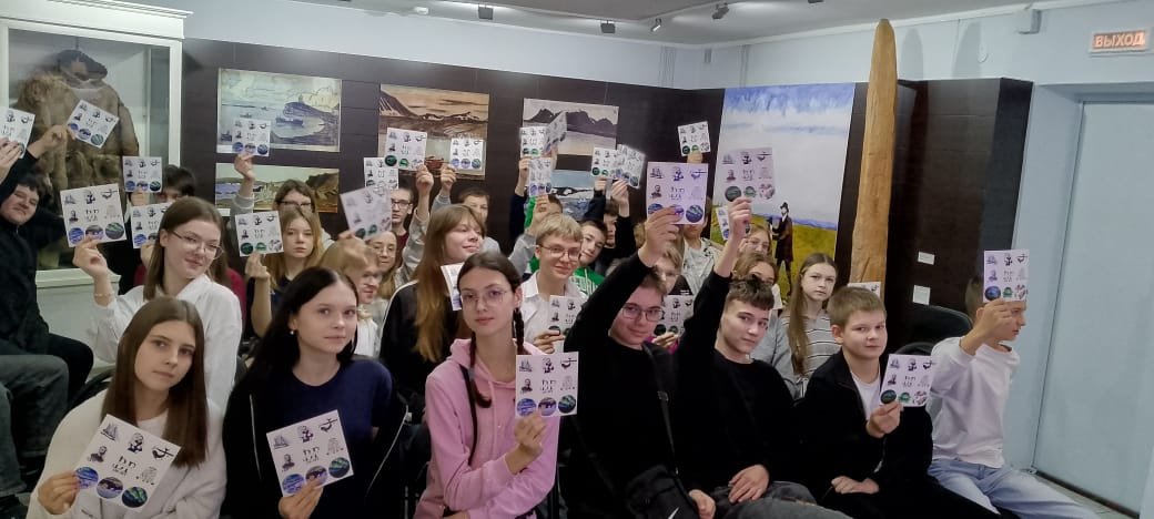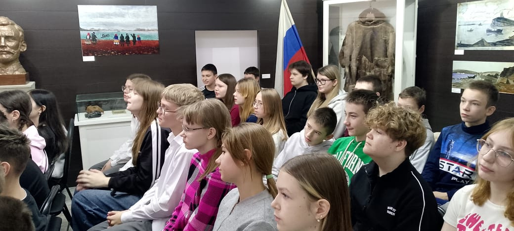 Посетили активисты и выставочный зал дома-музея. Выставка "В поисках неизвестных земель" посвящена 150-летию исследователя Арктики Владимира Русанова, а также его работе на архипелаге Новая Земля. На выставке ребята увидели карты Новой Земли, фотографии экспедиций, геологические образцы и живописные работы ненца Тыко Вылки - проводника и друга Владимира Русанова.