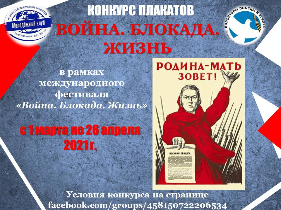 Молодёжный клуб РГО «Сахара» в Египте совместно с организацией «Волонтёров Победы» в Египте приглашает всех желающих в возрасте от 11 лет принять участие в Международном конкурсе плаката «Война.Блокада.Жизнь.». Конкурс посвящен 80-летию начала Великой отечественной войны и блокады Ленинграда. Информационным партнером конкурса выступает Детское телевидение и Медиашкола «Юная планета».
