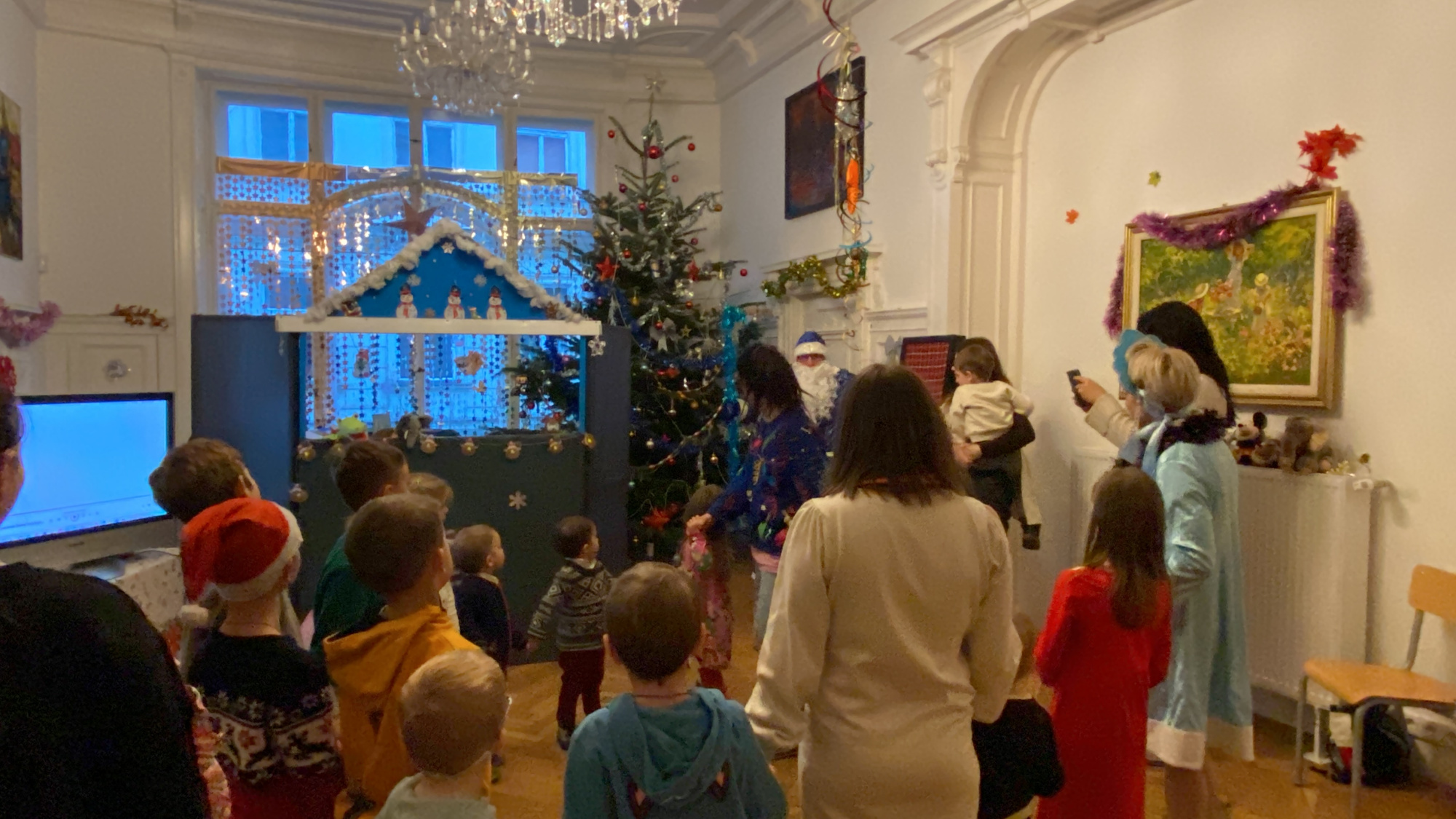 Дети строили лодку, водили хороводы, пели новогодние песни и рассказывали стишки, а в конце всех ждали сладкие подарки из России от Дедушки Мороза.