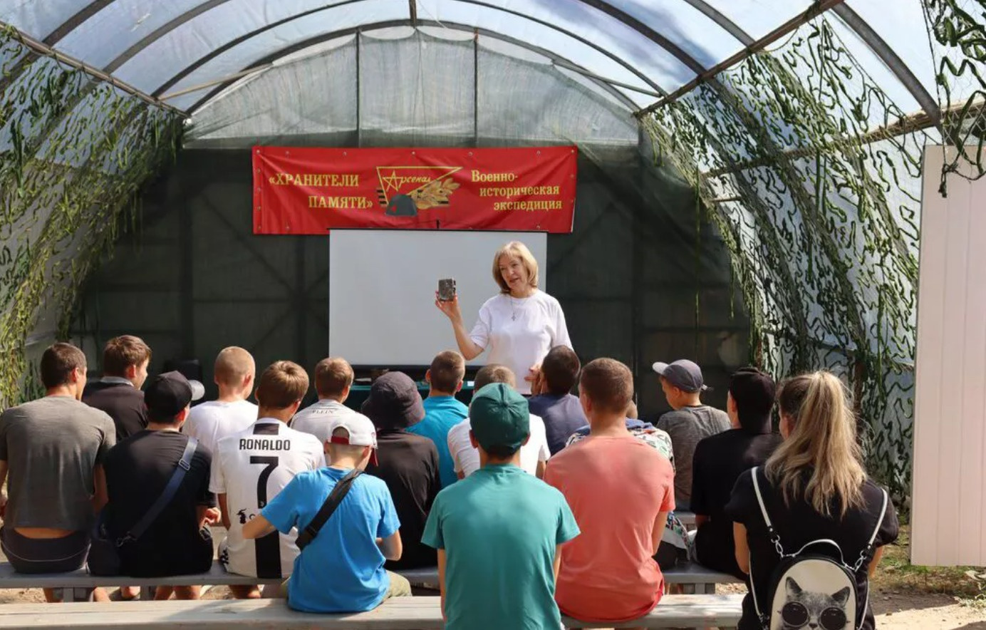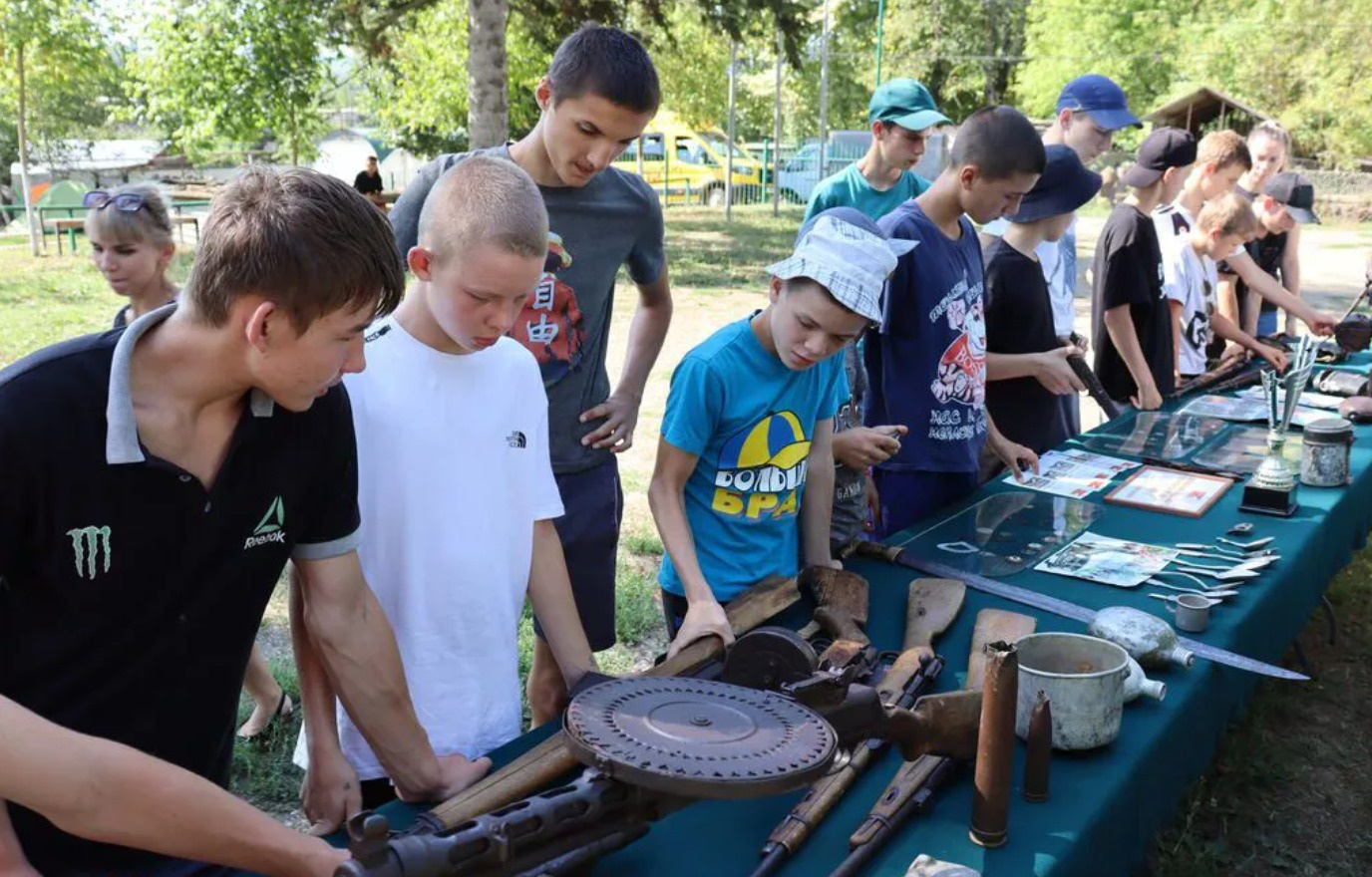 На территории оборонно-спортивного лагеря поисковой организации “Арсенал” в г. Хадыженске проведена интерактивная экскурсия по музейной экспозиции военных артефактов, найденных в ходе поисковых экспедиций на Туапсинском оборонительном направлении.