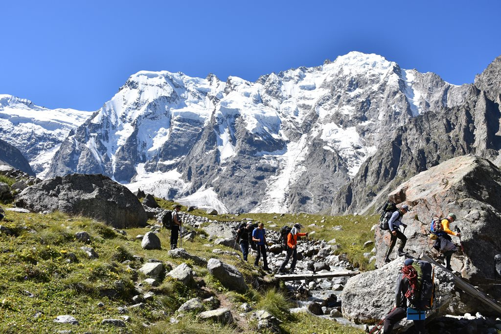 Команда Молодёжного клуба Русского географического общества «Альтаир» в рамках образовательного проекта «Школа безопасности» 2020 совершила выезд в верховья Безенгийского ущелья для завершающего этапа подготовки по программе «Альпинист России». Руководителем программы выступил спасатель международного класса восходитель на высочайшие вершины мира, Азнаур Аккаев.