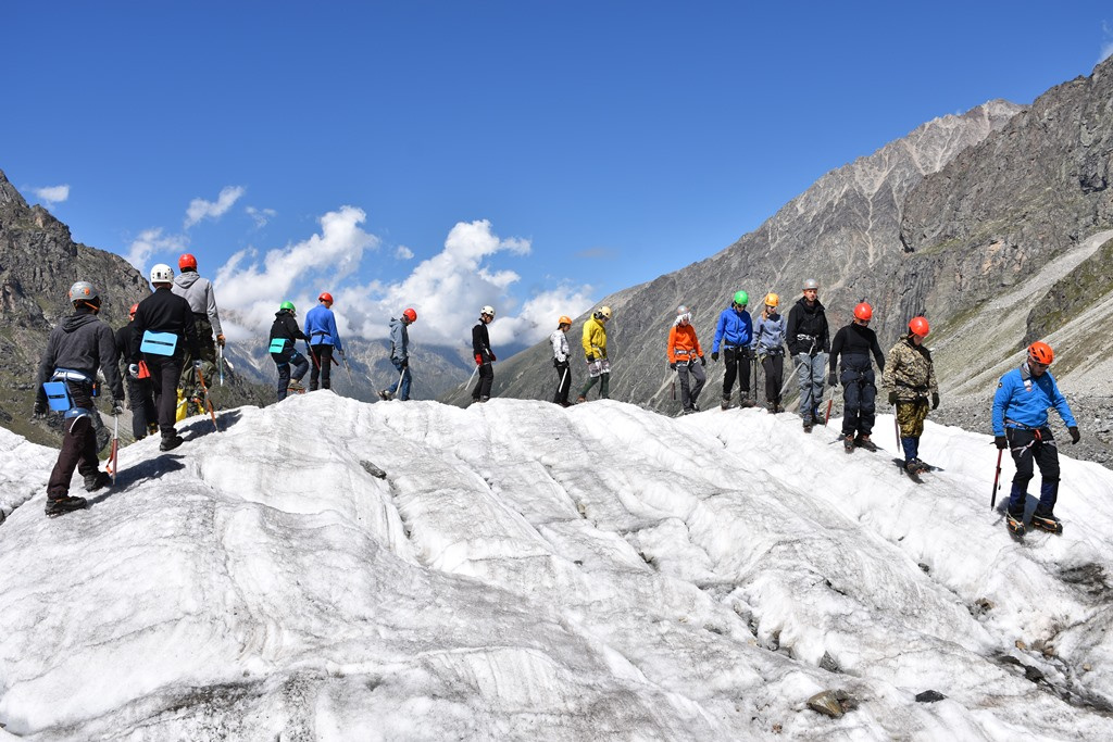 На следующий день команда отправилась в учебно-тренировочный поход в ущелье Мижирги, откуда открывался фантастический вид на Северный Массив Безенгийского района Главного Кавказского хребта, в районе которого расположены шесть из восьми гор-пяти тысячников Кавказа. Здесь на ступени ледника Кундюм-Мижирги участники проекта отработали передвижение по ледовому рельефу, а также прошли занятия по ледолазанию с верхней страховкой, используя ледорубы, кошки и страховочное снаряжение.