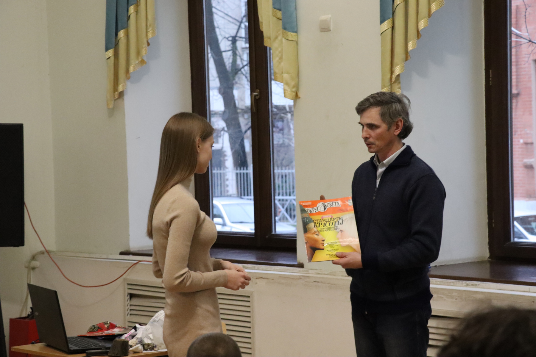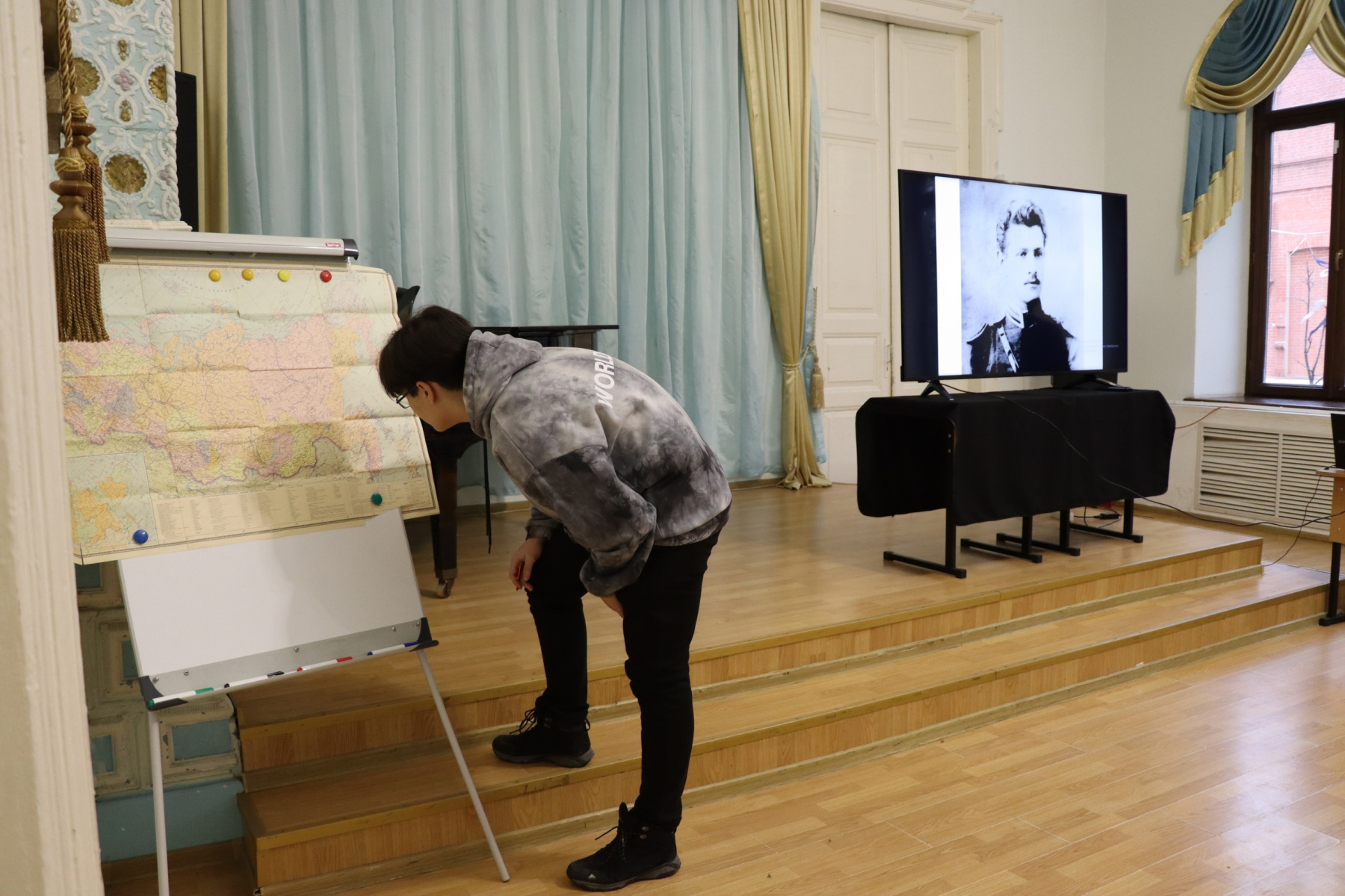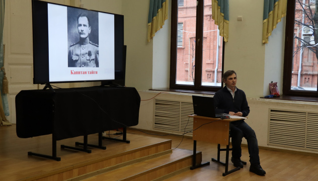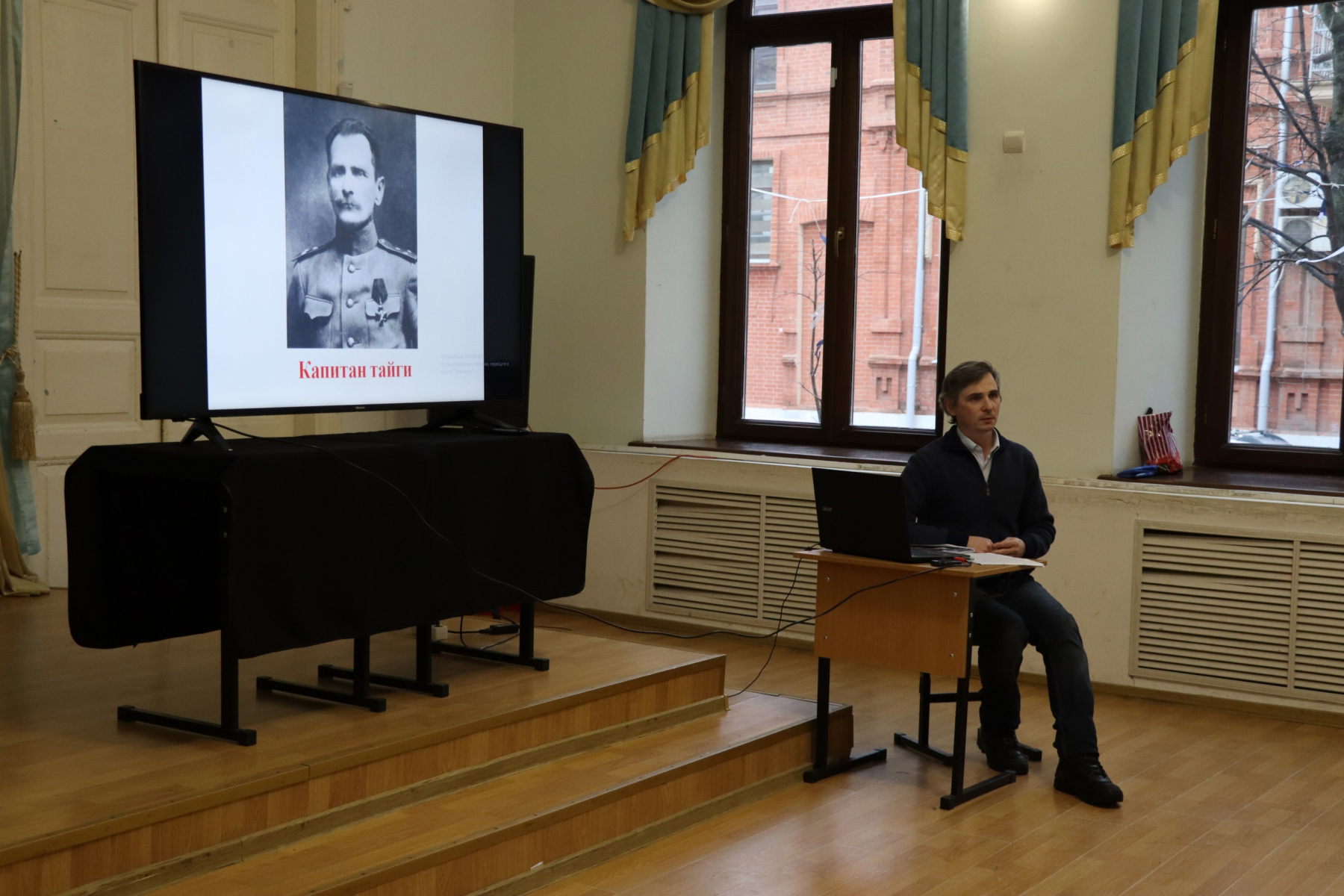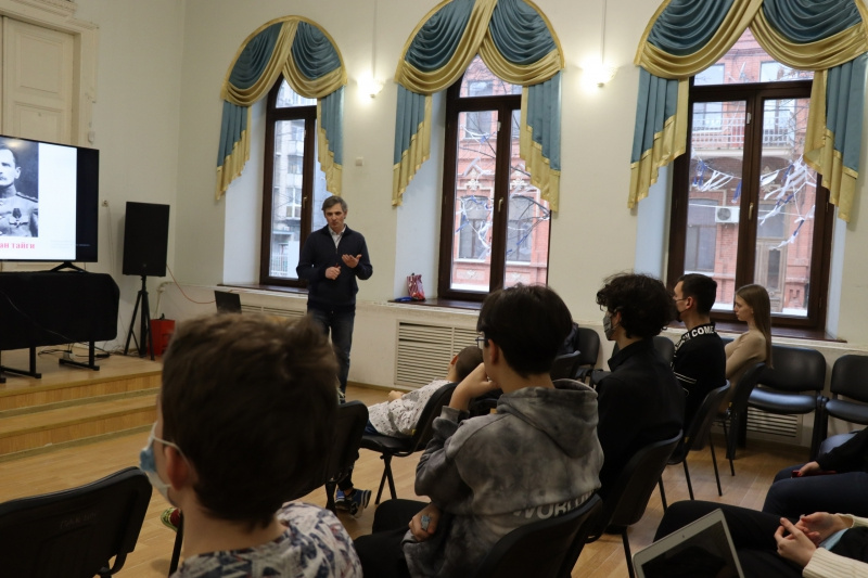 Участники встречи познакомились с судьбой одного из главных исследователей Дальнего Востока Владимира Клавдиевича Арсеньева, совершившего множество экспедиций, благодаря которым осталось меньше белых пятен на карте России. Поскольку, научные интересы у Владимира Клавдиевича были весьма разнообразны, в ходе экспедиций были выполнены работы по картографии, геологии, метеорологии, ботанике, зоологии, этнографии, археологии, а еще он хорошо рисовал, писал книги, а также преподавал в Дальневосточном институте. Повесть В. К. Арсеньеве «Дерсу Узала» была экранизирована несколько раз - в 1961 советским и армянским кинорежиссёром и сценаристом Агаси Арутюновиче Бабаяном, а в 1975 году японским кинорежиссёром, сценаристом и продюсером Акирой Куросавой. Для более полного представления об Арсеньеве можно посмотреть документальный фильм «Владимир Арсеньев. Капитан тайги»перейдя по ссылке https://www.youtube.com/watch?v=CeBuSrHvJwg В заключение Д.М. Камкин обратился к аудитории с вопросами и самых активных студентов отметил памятными подарками.