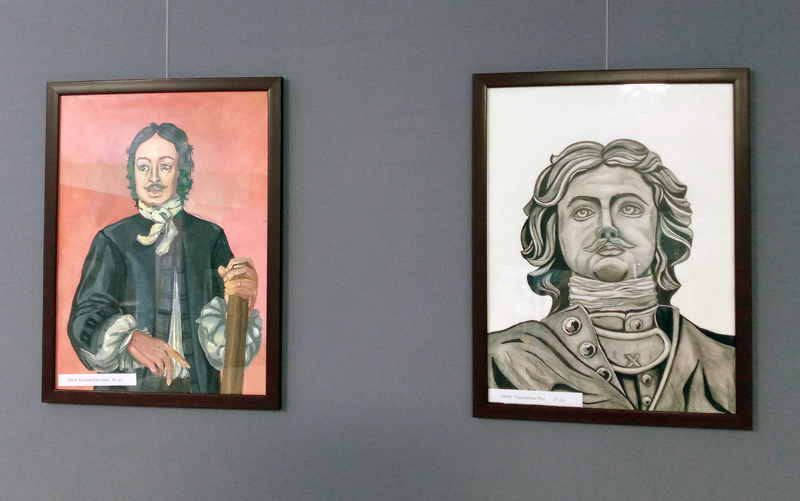 Картины были выполнены разными материалами: уголь, акварель, карандаш, сангина, и в разных техниках. На картинах Ершовой Анастасии и Брызжиной Анастасии Петр запечатлен за работой. В руках у него топор он лично участвует в создании кораблей. У Лузиной Дарьи Петр уже командует российским флотом. Бодиско Наталья, Кутрынина Алина, Чижова Алина, Беляева Светлана, Уксуменко Яна, Лукьянова Варвара представили портреты Петра I в различные этапы его жизни.