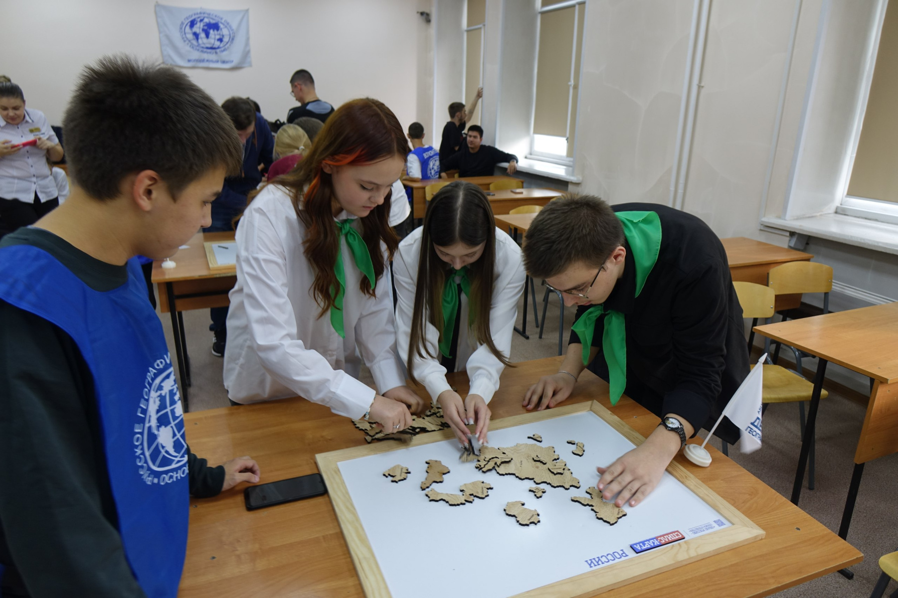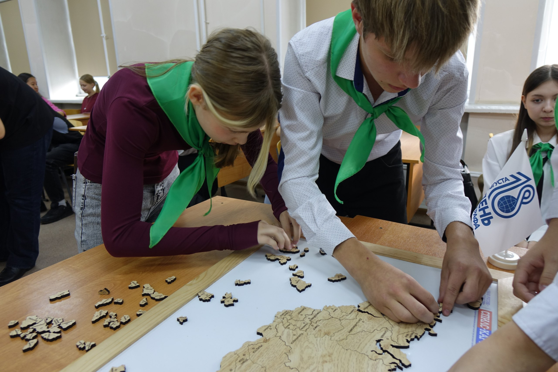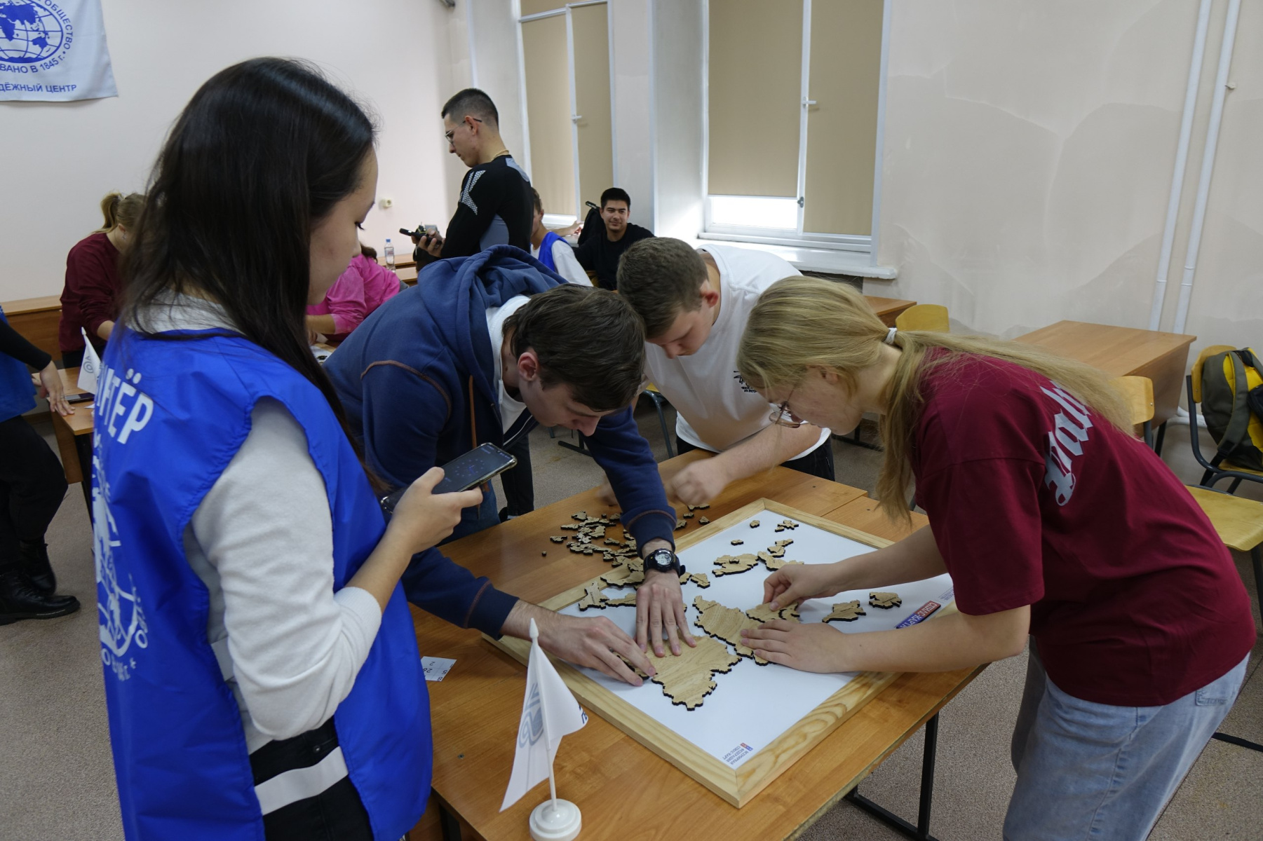 В аудитории царила атмосфера концентрации мысли, участники сосредоточено работали над пазлом, стараясь опередить команду соперников. За ходом мероприятия следили помощники - добровольцы Молодёжного клуба РГО «Хан Тигир», с помощью секундомера они отслеживали время сбора карты каждой команды.