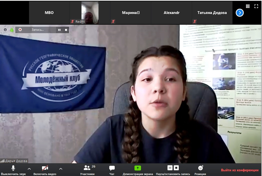 На одном из секционных заседаний Форума Дарья Евгеньевна выступила в качестве докладчика и продемонстрировала в формате видеоролика результаты своей проектно-исследовательской и просветительской деятельности, проводимой в рамках работы Молодежного клуба РГО и Фенологической сети Общества, отметив особо при этом, что "… мир меняется стремительно. Негативная деятельность человека - приводит к гибели многих живых организмов, в том числе и пчел. И если ситуация радикально не изменится, к 2035 году все пчелы на Земле могут исчезнуть навсегда. А вслед за ними животные и люди. Сегодня человечество начинает осознавать, что движение к глобальной катастрофе - это общая вина. Природа ищет свои пути защиты, имея колоссальные запасы прочности, но нам тоже надо стараться ей помочь, чтобы идти вместе дальше".