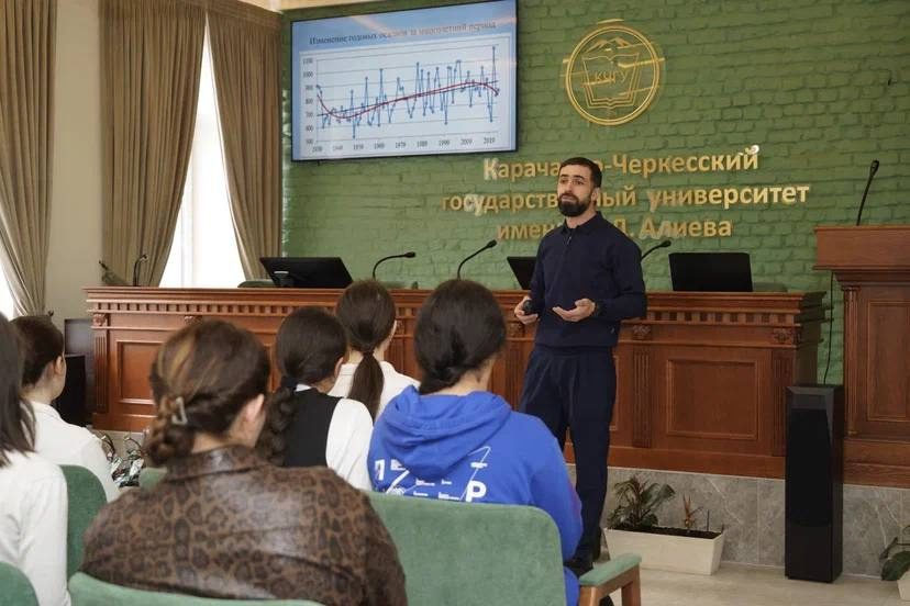 Шамиль Тохчуков – сотрудник научно-исследовательской лаборатории геоэкологического мониторинга КЧГУ и Руководитель Молодёжного центра РГО КЧР провел для школьников экскурсию по факультету и прочитал лекцию по геоэкологии, также рассказав о деятельности Молодёжного центра РГО, который был открыт в стенах КЧГУ в конце 2024 года. Центр предоставляет участникам возможность стать частью большой географической семьи, участвовать в интересных проектах, встречаться с известными исследователями и путешественниками.