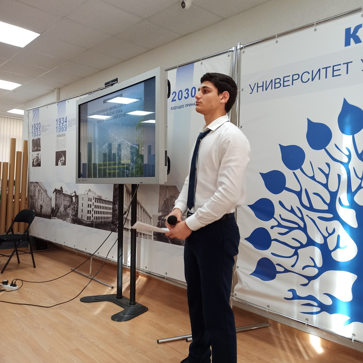 Владимир Налбандян представлял работу по радиационной аномалии в районе посёлка Никитино. Аномалия была определена прибором СРП 97-01 по одному левому притоку реки Малая Лаба. Аномалия достигает 80 мкР/час. Вызвана повышенным содержанием радона, который скорее всего образуется на данной территории в глубине земной коры при распаде тория. Данную работу Владимир выполнил совместно со студентом второго курса КубГУ Елисеем Шаровым и профессором кафедры "Геофизики и геологии", доктором геолого-минералогических наук Зоей Алексеевной Толоконниковой.
