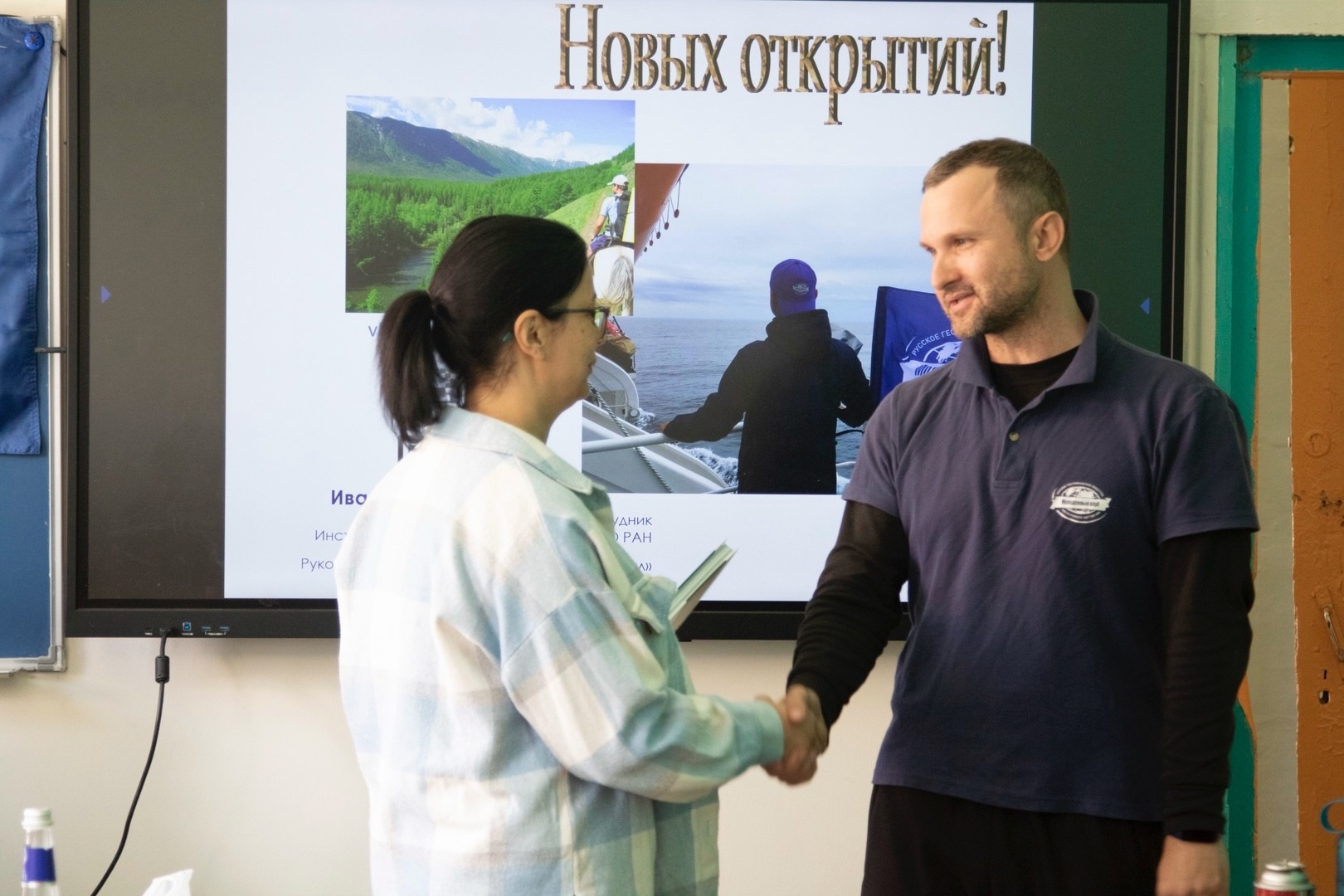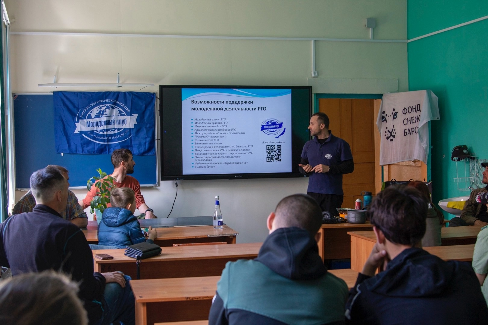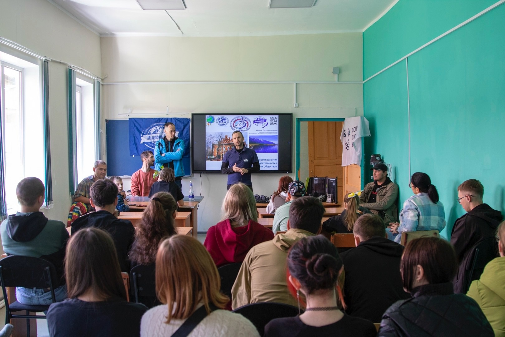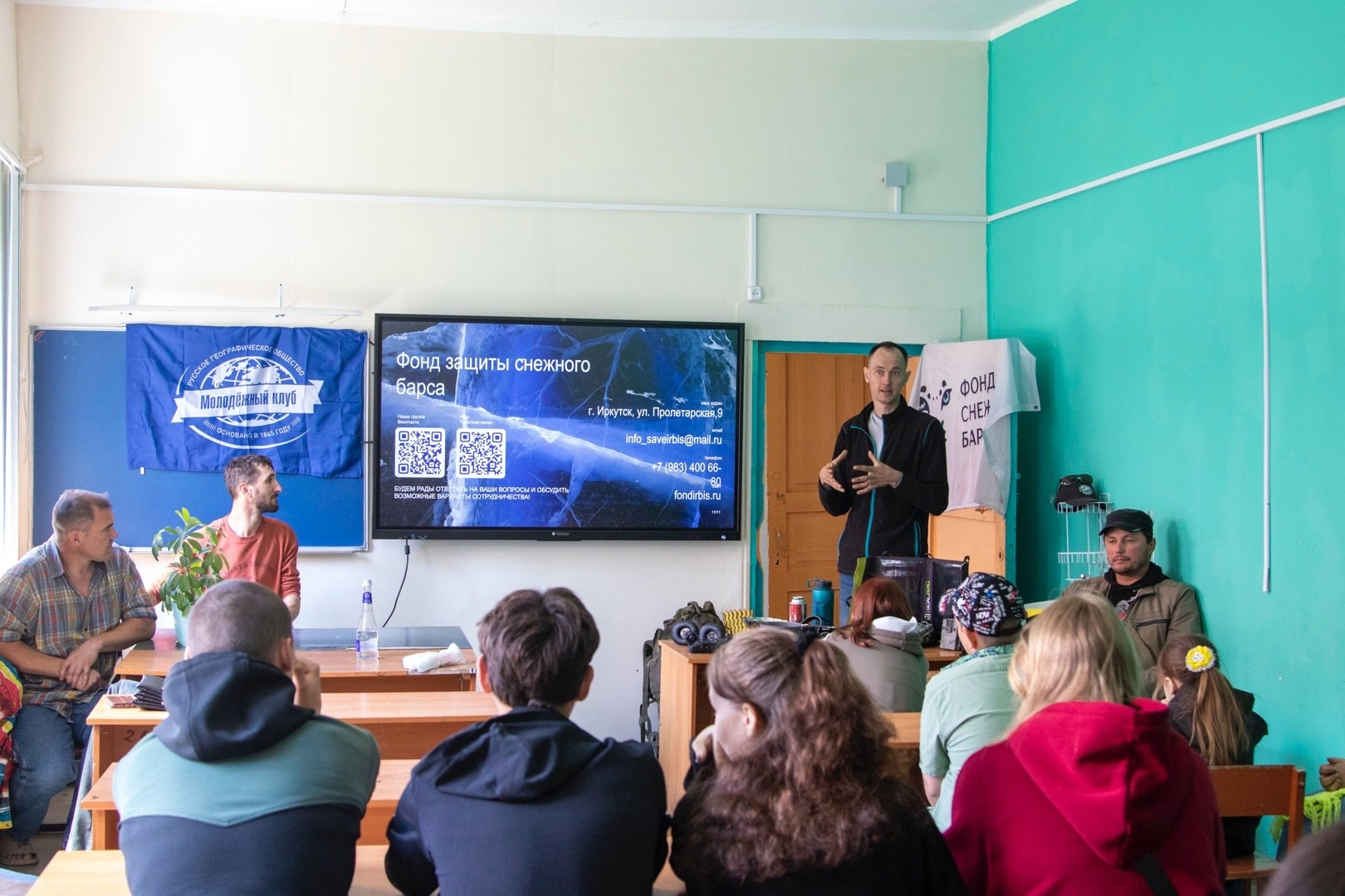 Представители Молодёжного клуба РГО "Байкал" и Фонда "Снежный барс" рассказали о том, как интересно заниматься наукой, а также о своих многочисленных путешествиях и открытиях, показали оборудование, которым они пользуются. Ребята узнали, как можно делать первые шаги в науку. Наиболее эрудированные участники беседы получили небольшие призы с их автографами, а школе они подарили замечательную книгу от РГО "Методика ведения фенологических наблюдений".
