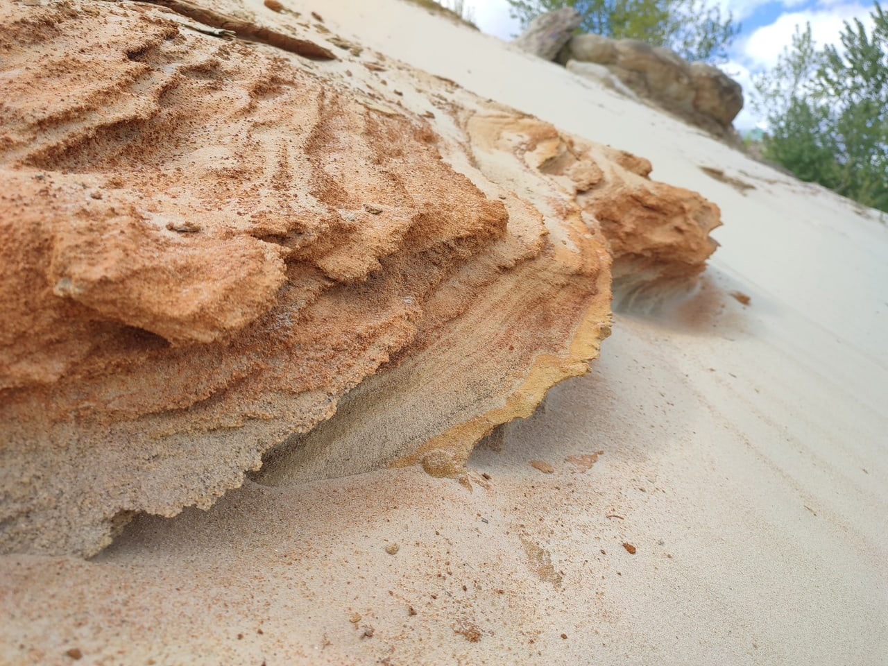 Основной состав песков кварцевый. Они обладают горизонтальной слоистостью, столбчатой отдельностью и мелко-зернистой структурой. В результате техногенной деятельности западный блок Красненьского карьера, прилегающий к улице Рылеева, почти полностью выработан. Изучался небольшой останец, оставшийся после выемки строительной организации.