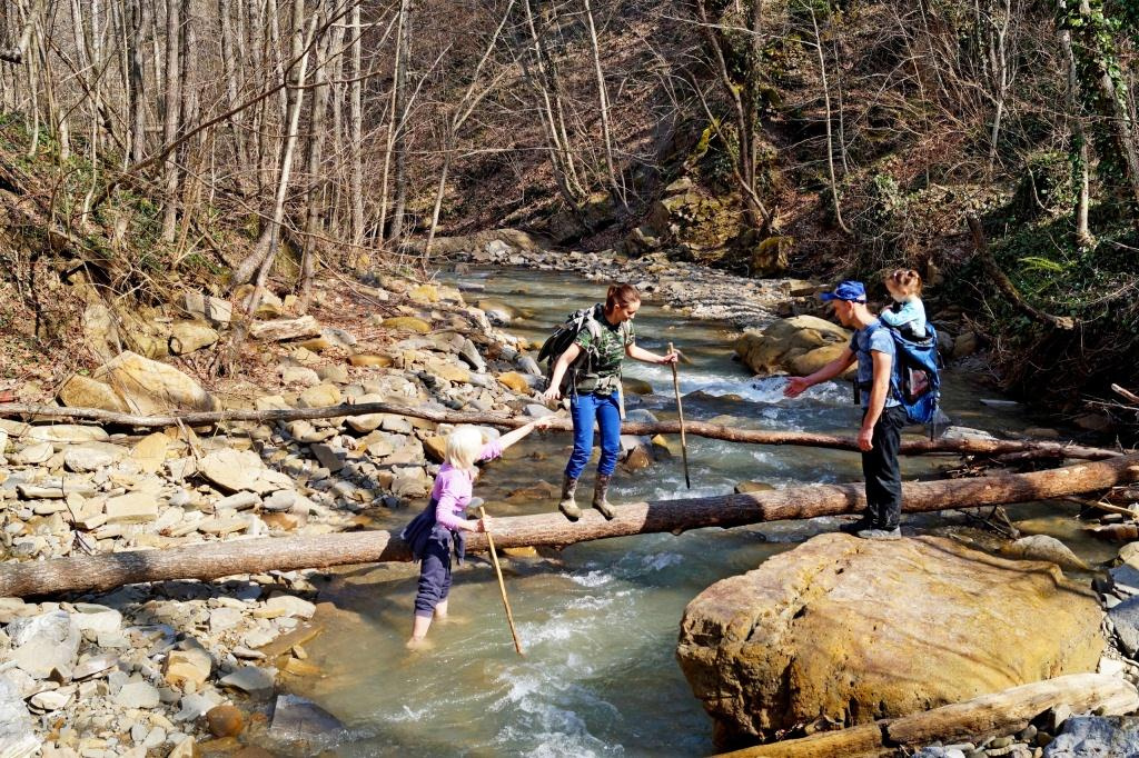 Далее двигались по берегу реки с замысловатыми поворотами, небольшими спусками в овраги и подъемами на их склоны. С тропы можно увидеть обнажения различных геологических слоев, нагромождения окаменелых кораллов. На отмелях интересно наблюдать за поведением мелких рыбешек, шустрых крабиков, любопытных рачков и других обитателей чистейших вод верховьев Хадажки. Пару раз речку нужно переходить вброд. Сразу за поляной сделали привал.