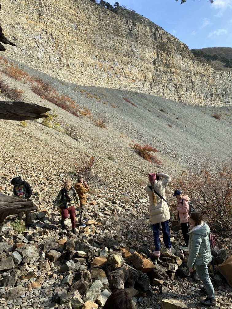 Группу активистов встретила заместитель начальника отдела по экологическому просвещению Алла Евгеньевна Письменная. Экскурсия проходила по маршруту «Каньон».Алла Евгеньевна очень интересно рассказала об реликтовых можжевеловых лесах, об охране сухопутной черепахи Никольского. Подойдя к обрыву, участники выезда смогли наблюдать фронтальную часть оползня, которая представляла собой вертикальную стенку высотой до 150 метров. В знак благодарности за проведенную экскурсию от МК РГО на базе «Малой академии» был подарен сувенир в виде черепахи, который изготовила одна из активистов клуба Софья Камкина.