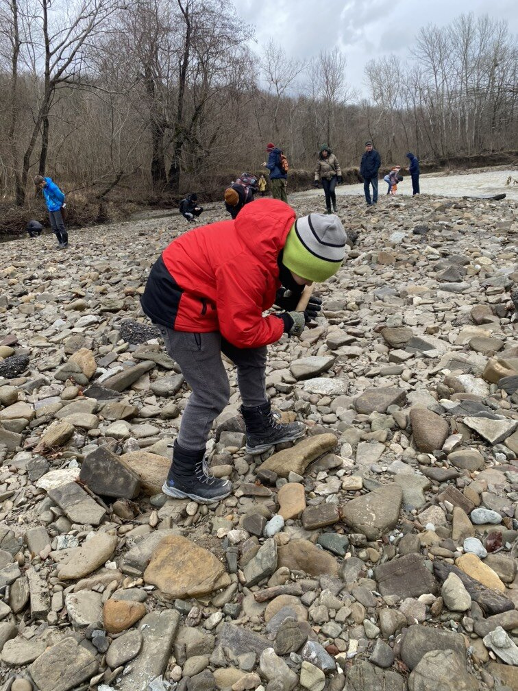 Ребята, занимающиеся геологией произвели отбор палеонтологических образцов с борта реки. Были найдены отпечатки бурых водорослей, отпечаток аммонита и следы ползания илоедов - ихнофоссилии. Ихнофоссилии (от греч. ихнос - «след») ископаемые следы жизнедеятельности организмов. К сожалению высокая вода в реке не позволила найти протяжённые выходы алевролитов, в которых можно найти хорошей сохранности аммониты. Владислав Пчелинцев отвечал на вопросы ребят связанные с палеонтологией и минералогией. Софья Лукьяшко, Елизавета Ковелина и Виктория Лось нашли грибы дрожжалку оранжевую (лат. Tremella mesenterica), эксидию железистую (лат. Exidia glandulosa), встретили птиц: Дубонса (лат. Coccothraustes coccothraustes), Обыкновенную лазоревку (лат.Cyanistes caeruleus), Черноголовую гаичку (лат. Poecile palustris)из отряда Воробьинообразные, Среднего пестрого дятла (лат. Leiopicus medius) из отряда Дятлообразные, Дрозда дерябу (лат. Turdus viscivorus), и Дрозда черного (лат.Turdus merula).