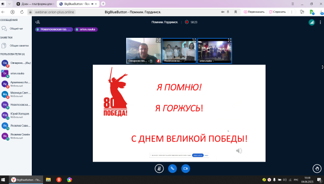 4 июня активисты Молодежного клуба РГО "Россошь" в рамках проекта "Содружество Донбасс" выступили организаторами межрегионального телемоста, который был приурочен к 80-летию Победы в Великой Отечественной войне и прошел совместно с обучающимися регионального центра «Орион» и ГБОУ "Новопсковская газопроводская СШ" Луганской народной республики,