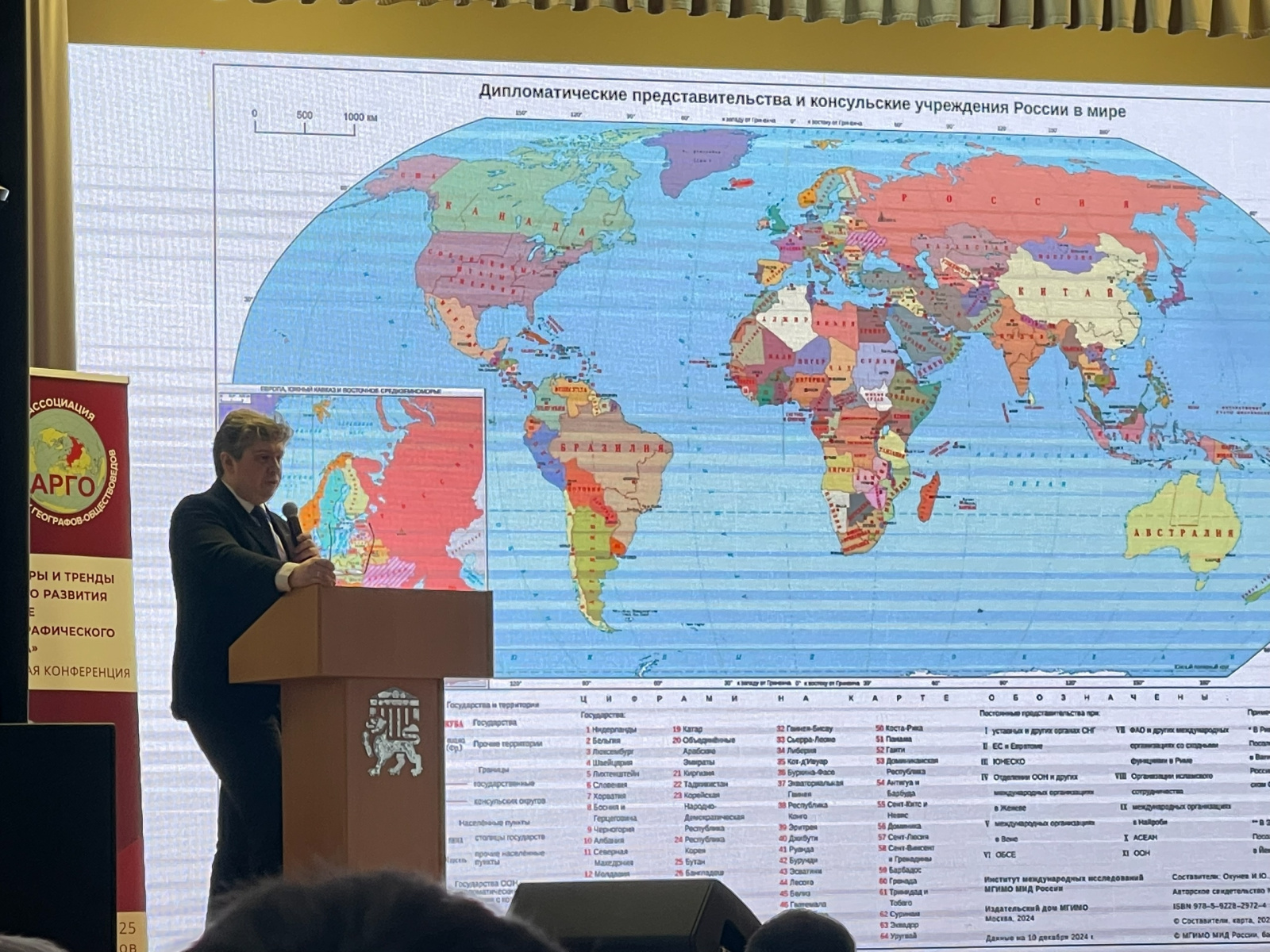 15 сентября Игорь Окунев выступил на пленарном заседании с докладом «Дипломатическая география: предметное поле и методологическая рамка новой субдисциплины в общественной географии» и рассказал об исследовании по данной теме, которое проводится в рамках гранта Русского географического общества. Игорь Окунев описал аспекты этого нового направления в общественной географии и его потенциал для исследований международных отношений.