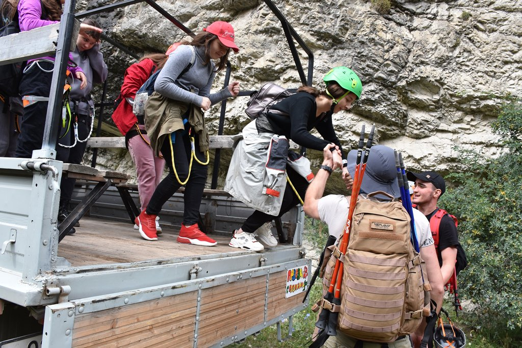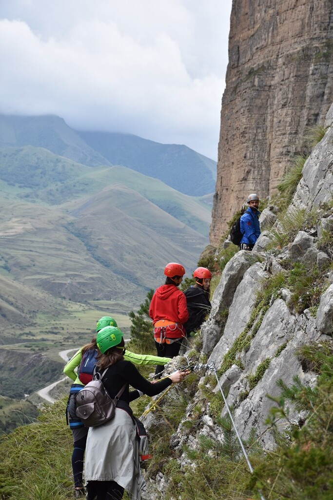 Пройдя инструктаж по технике безопасности и надев страховочное снаряжение, в сопровождении инструкторов участники проекта отправились по трёхкилометровому участку вдоль скалистой полки, с крутыми подъёмами и спусками, оборудованными страховочными перилами.