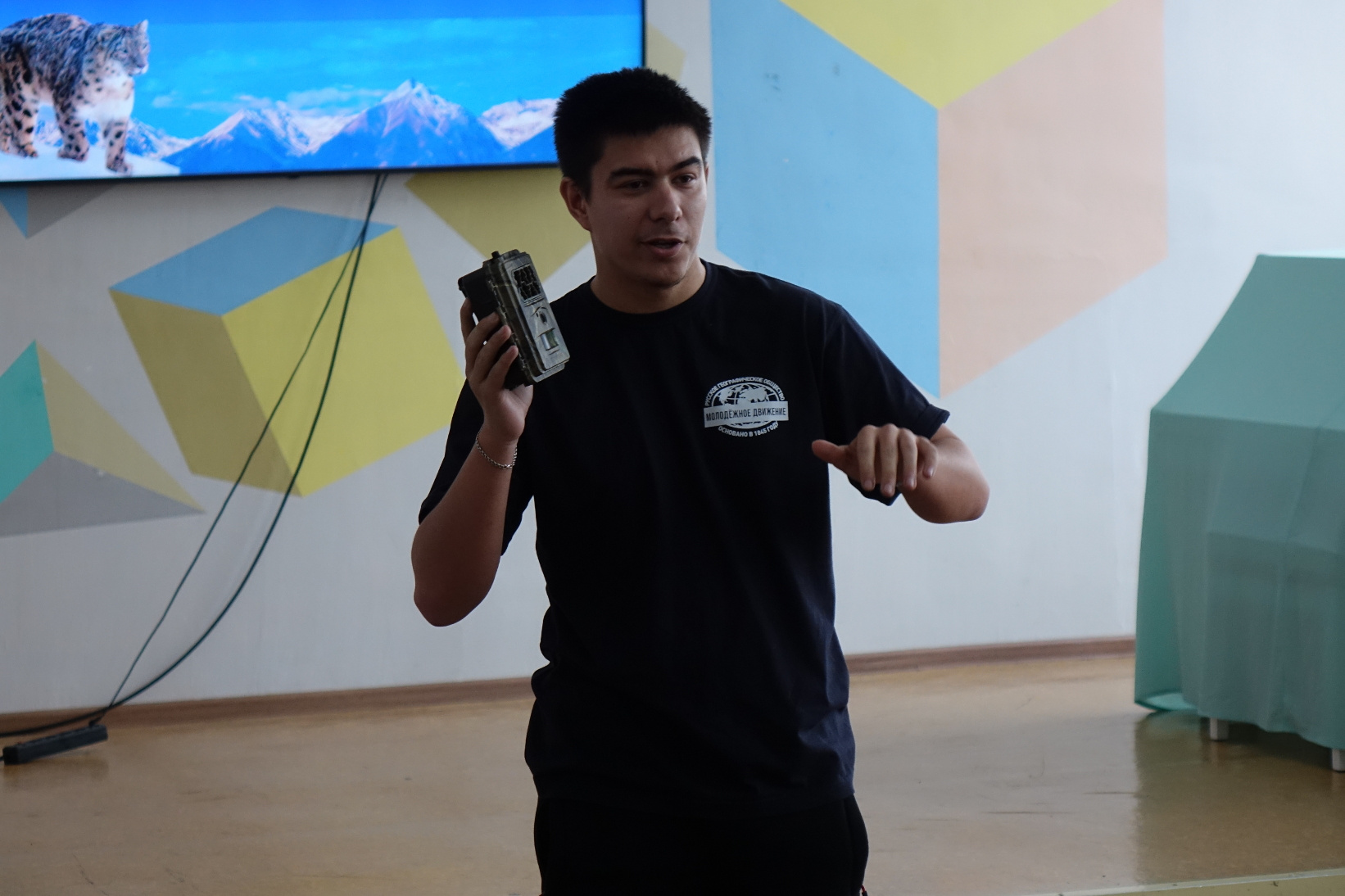 Отельный рассказ тематической встрече был посвящён – ирбису, дикой кошке юга Сибири. Ребята узнали о местах обитания редкой кошки, её особенностях поведения. Особый интерес вызвала фотоловушка - устройство с помощью, которого фиксируют редких животных. Школьникам продемонстрировали браконьерские петли, как основной вид угрозы и причины сокращения численности снежного барса. После просмотра фильма, учащиеся узнали о методах исследования ирбиса и охранных мероприятиях на территории Саяно-Шушенского заповедника.