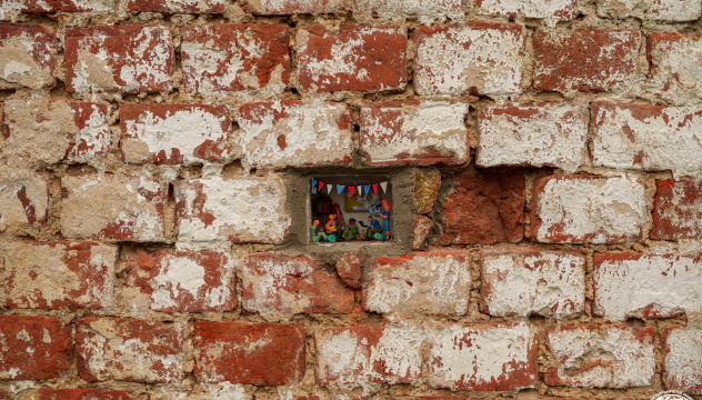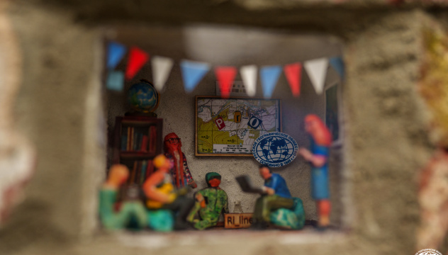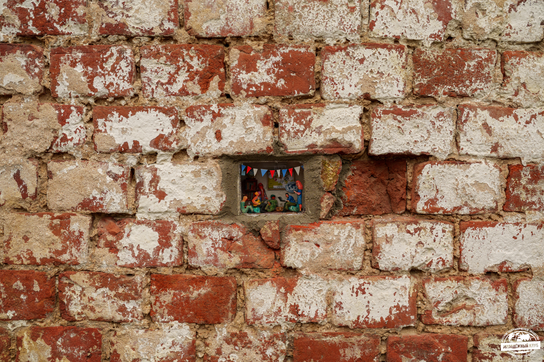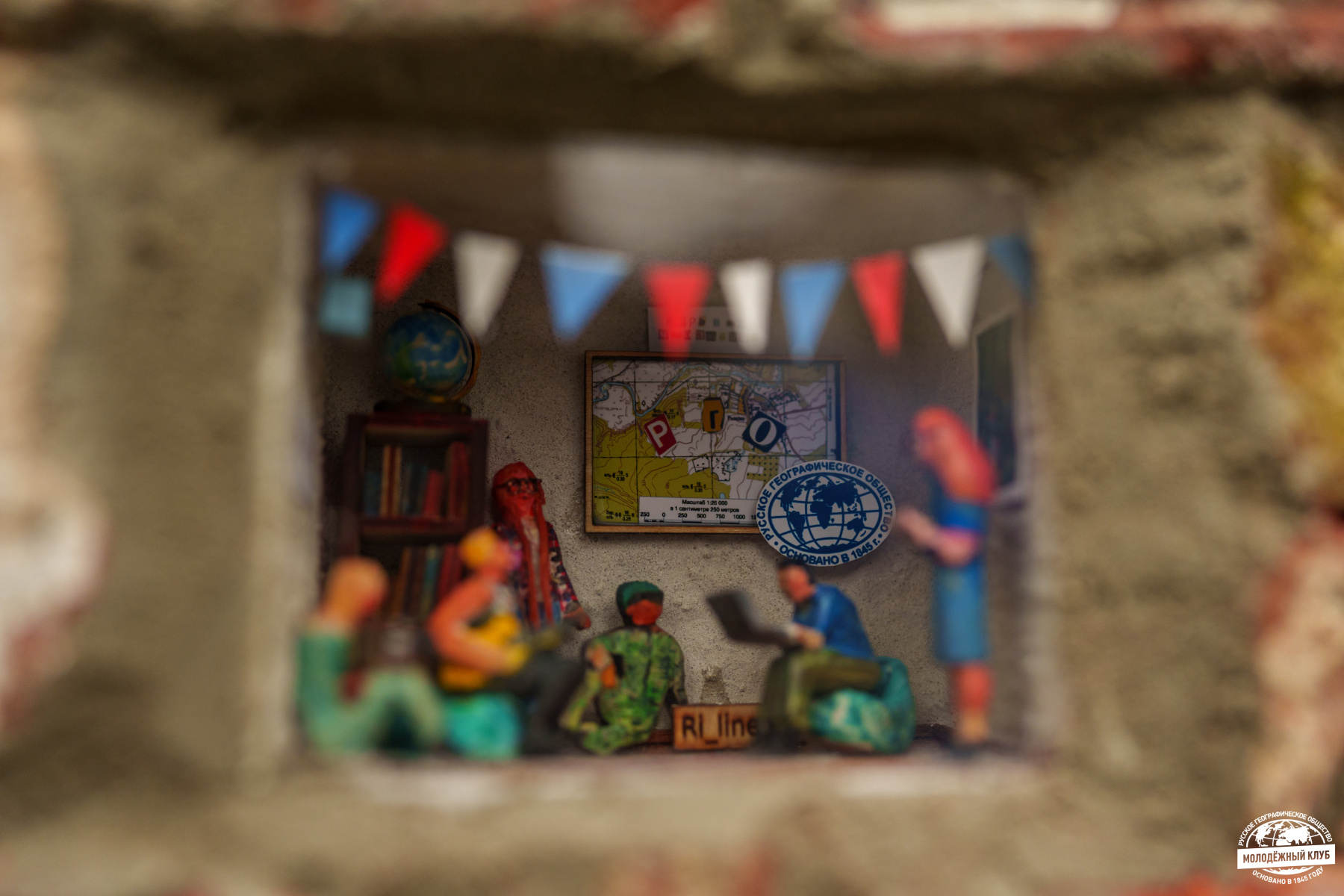 Каждый персонаж инсталляции занят любимым делом: пока одни герои создают уютную атмосферу песнями под гитару, другие работают с фотоаппаратом, ноутбуком, пишут план очередного мероприятия, плетут венки из полевых цветов. Любопытно, что прототипами миниатюрных человечков стали реальные люди — школьники, студенты и преподаватели, которых однажды объединило РГО, а география с того времени стала частью жизни. Задний план украшают карта, глобус и библиотека книг о туризме, ведь Молодёжный клуб РГО «Владимир» — не только дружеские вечерние посиделки, но и наука.