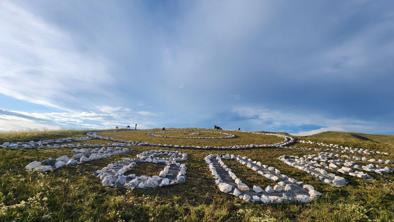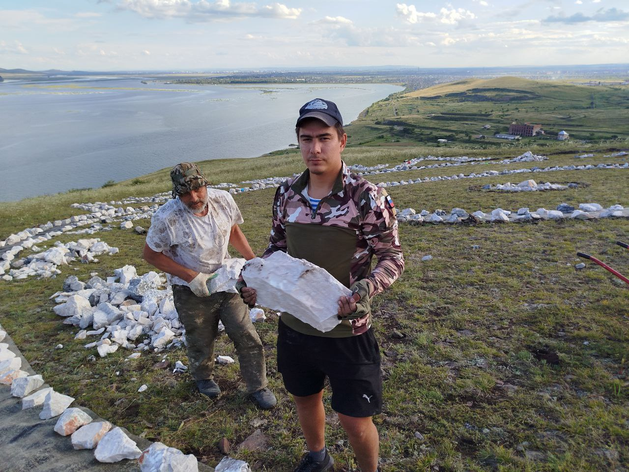 Проектирование, согласование и создание геоглифа заняли несколько месяцев. Самым сложным этапом стала доставка и подъём камня для выкладки. Несколько дней подряд активисты Молодёжного центра РГО Республики Хакасия и добровольцы под руководством Алексея Матнина, исследователя древних знаний, готовили площадку под геоглиф: скашивали растительность, наносили разметку и выкладывали солярный знак с аббревиатурой РГО.