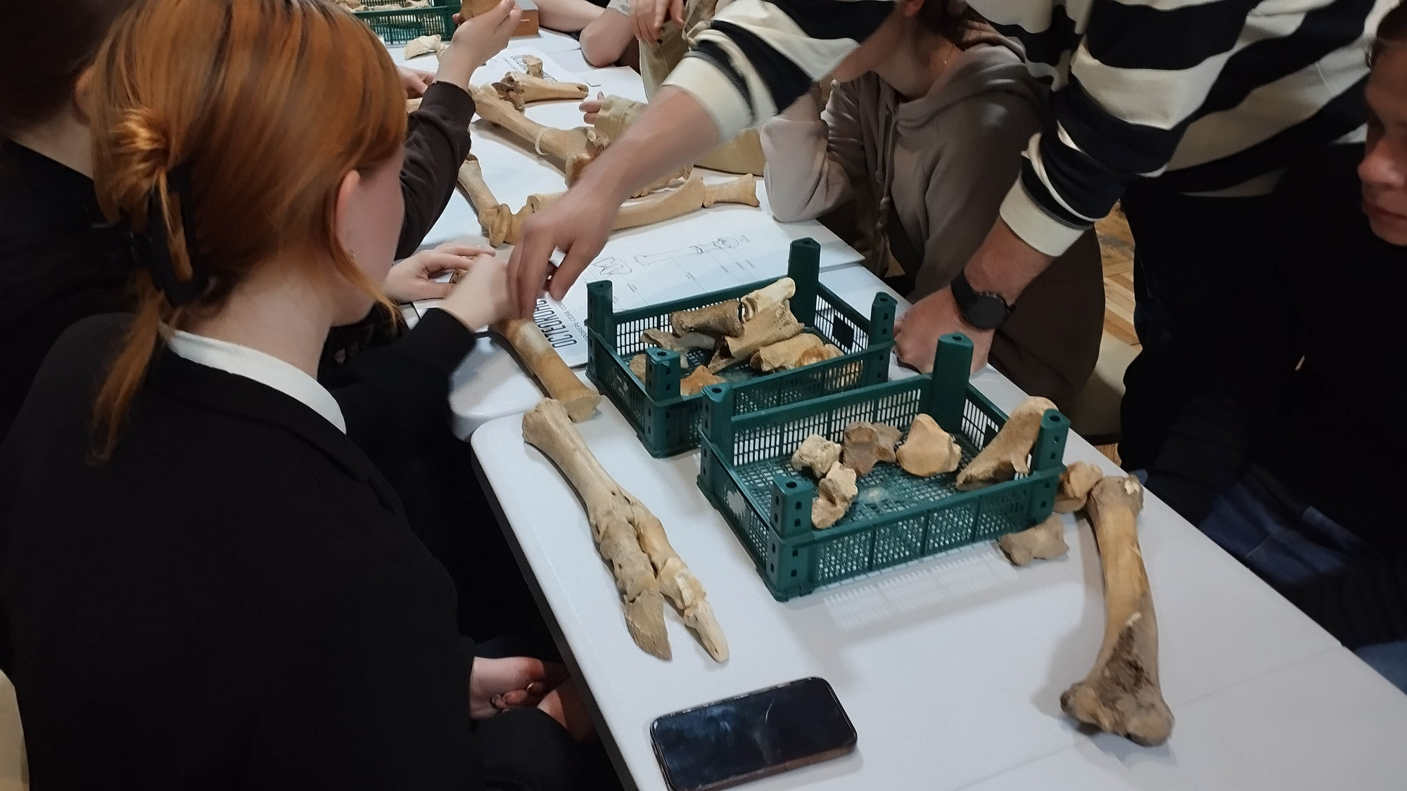 Занятие было посвящено остеологии. При этом весь раздаточный материал был натурным. Андрей Эдуардович кратко напомнил ребятам типы костей, строение трубчатой кости, функции костей. Далее перешел к демонстрации части конечностей коровы и лошади. На этих примерах ребята смогли воочию увидеть формирование конечности парнокопытного и непарнокопытного животного.