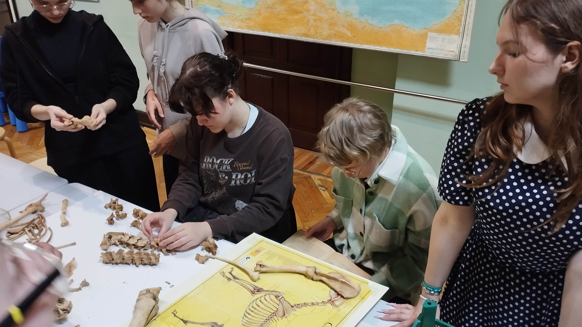 После этого началась практическая работа. Ребятам предстояло собрать конечность парнокопытного и непарнокопытного животного. С этим заданием ребята справились успешно. И в окончании встречи Андрей Эдуардович поставил перед учащимися коробочку с костным материалом, из которого предстояло собрать скелет собаки. К сожалению времени, немного не хватило, и был собран позвоночник, передняя и задняя конечность собаки.