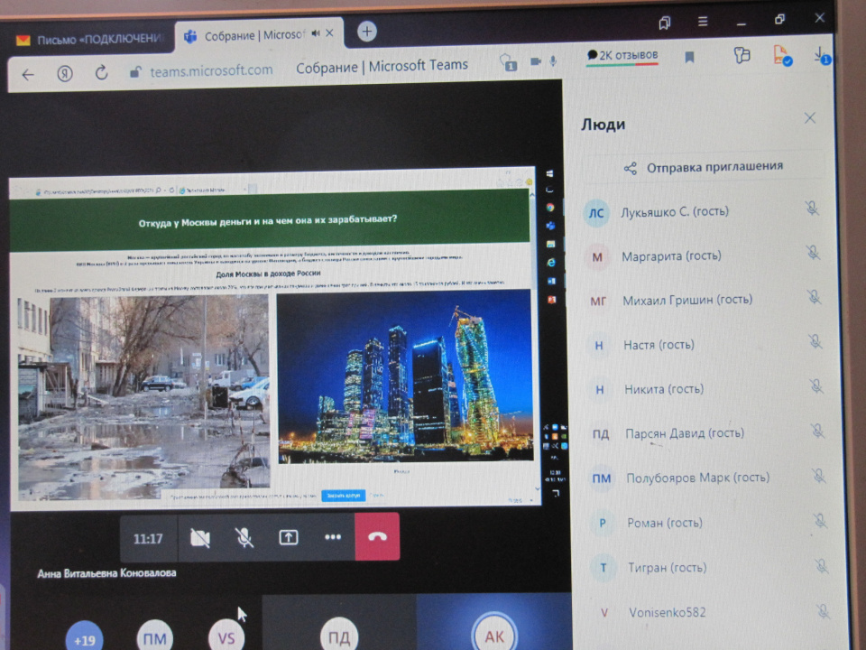 Анна Витальевна рассказала о ключевых исторических датах в формировании города Москва от момента закладки великим князем Юрием Долгоруким поселения в 1147 году на высоком Боровицком холме, в месте слияния рек Москвы и Неглинной, выше реки Яузы до наших дней. В конце XV века при князе Иване III Васильевиче Москва становится столицей Русского государства. В 1712 году статус столицы России был передан Санкт-Петербургу. В 1755 году Михаилом Ломоносовым и Иваном Шуваловым по приказу императрицы Елизаветы основан Московский университет. Во время Отечественной войны 1812 года Москва оказалась захвачена войсками Наполеона и сильно пострадала от пожара. В 1918 году в Москву из Петрограда переезжает правительство большевиков и Москва становится столицей РСФСР. Зимой 1941/42 годов произошла битва под Московй, в которой советские войска одержали первую крупную победу над вермахтом. В 1980 году Москва принимала XXII летние Олимпийские игры.Давид Парсян рассказал об экономике Москвы. Давид упомянул в докладе о том, что 80 % всех финансов России приходятся на крупнейший в российском масштабе финансовый центр и международный деловой центр - г. Москву.